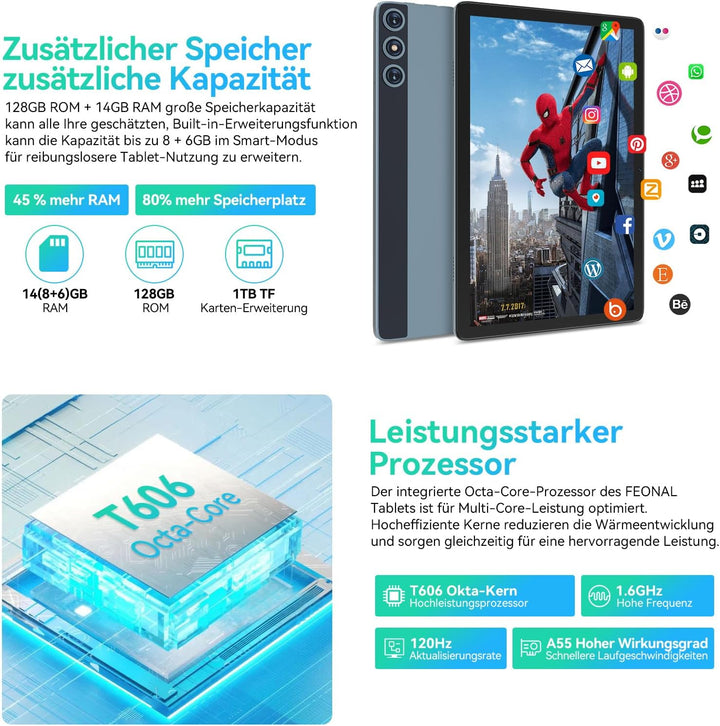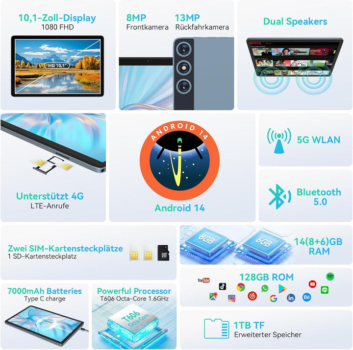 - ✨✨14GB RAM + 128GB ROM + 1TB Erweiterung:Das 10-Zoll-Tablet kommt mit 14GB RAM und 128GB ROM.Ob für die Arbeit, das Studium oder die Unterhaltung, es ist eine reibungslose Erfahrung.Das Android 14-Tablet kommt mit Google Play vorinstalliert, und mit