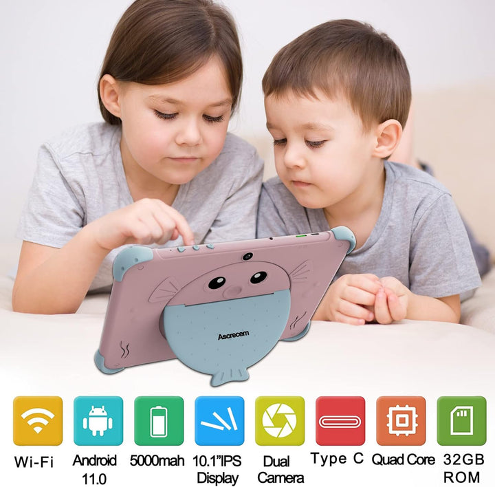 - [Neuestes Kinder Tablet]: Ascrecem tablet für kinder 10 zoll läuft auf dem neuesten Android 11.0 und ausgestattet mit Quad-Core-Prozessor, 2GB RAM, 32GB ROM, die Apps und Medien reibungslos laufen lässt. Ascrecem tablet kinder unterstützt wifi,