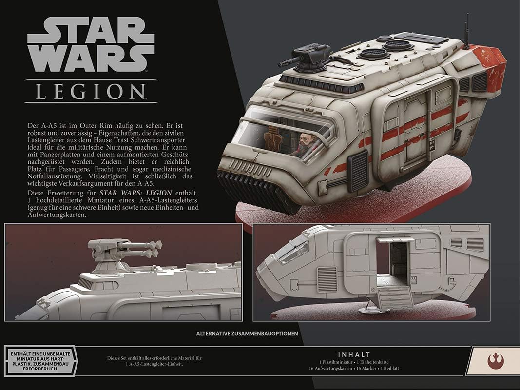 - Mit dieser Erweiterung könnt ihr eure Star Wars Legion um einen A-A5-Lastengleiter ergänzen. Der vielseitige Schwertransporter bietet Platz für Passagiere, Fracht und medizinische Notfallausrüstung