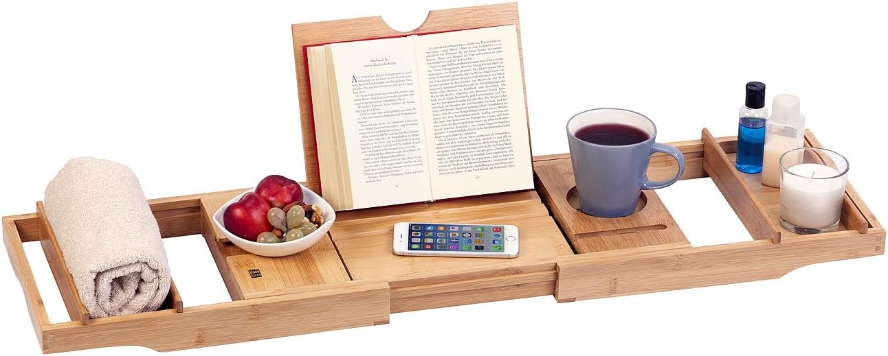 - Komfortables Badewannen-Regal und Bett-Tablett mit grosser Ablagefläche • Smartphone-Halter für Geräte mit bis zu 12 mm Tiefe • Passend für praktisch alle Standard-Badewannen • Hochwertiges Material: 100 % Bambus, wasserabweisend,