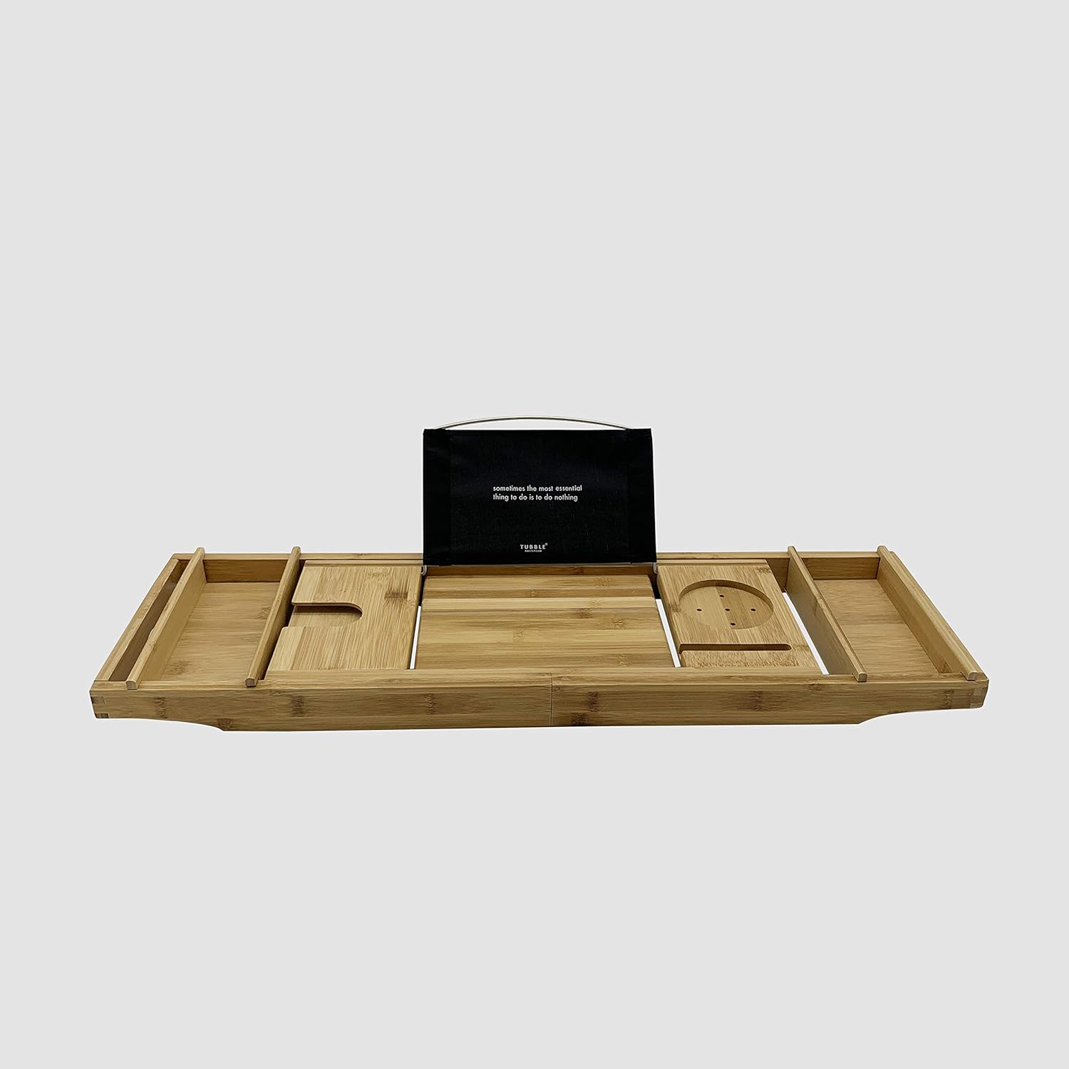 - Das Tubble Bambus-Badetablett wurde entwickelt, um Ihre Accessoires, wie ein Glas Wein oder ein Buch, fest an Ort und Stelle zu halten.