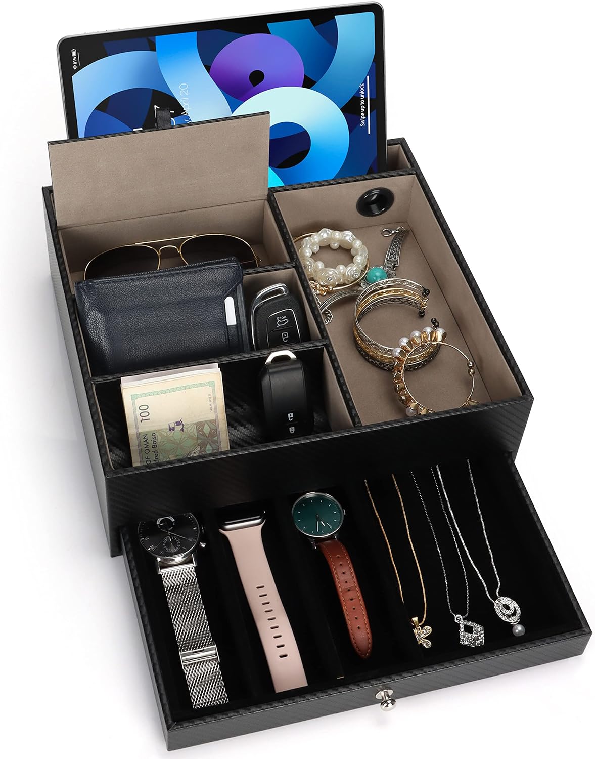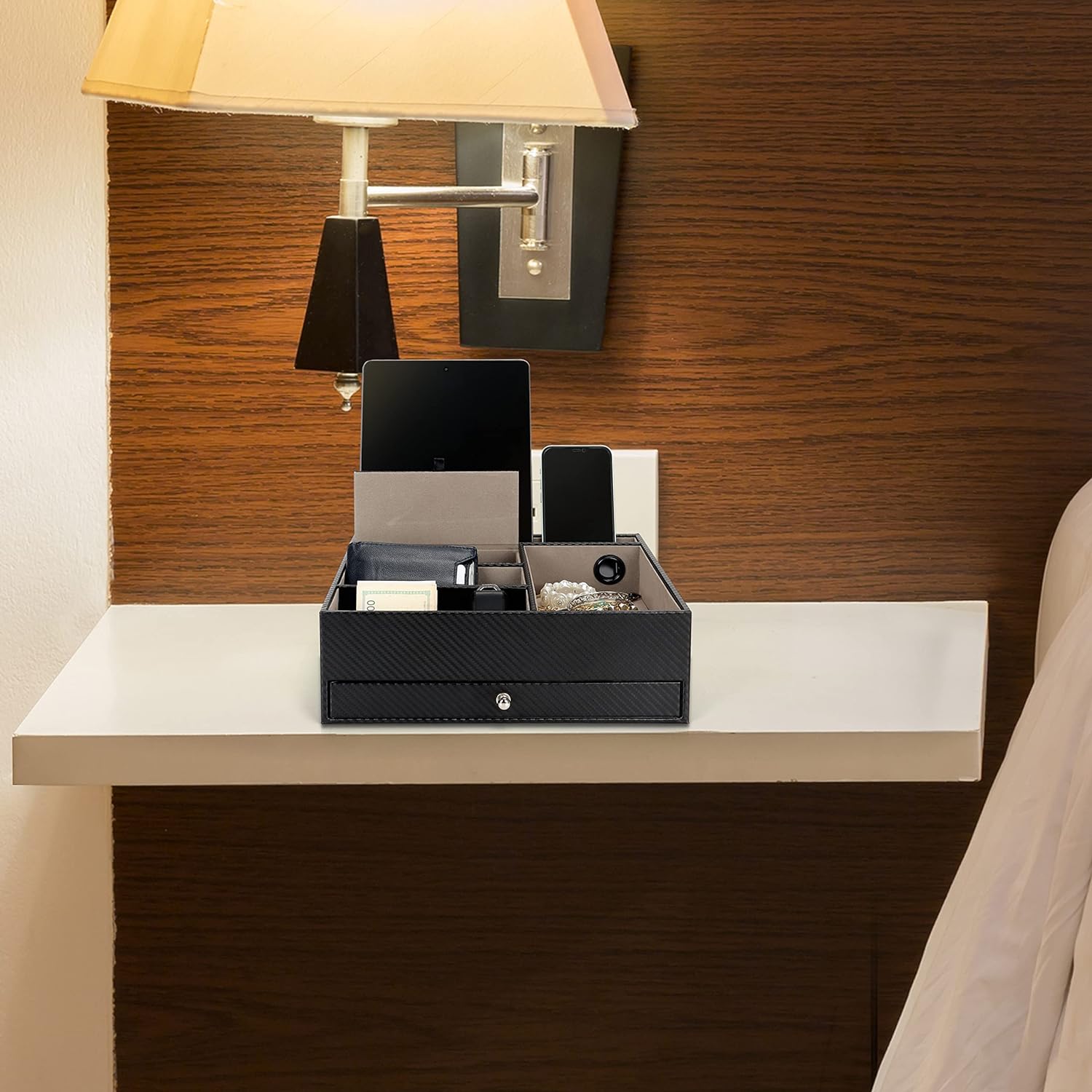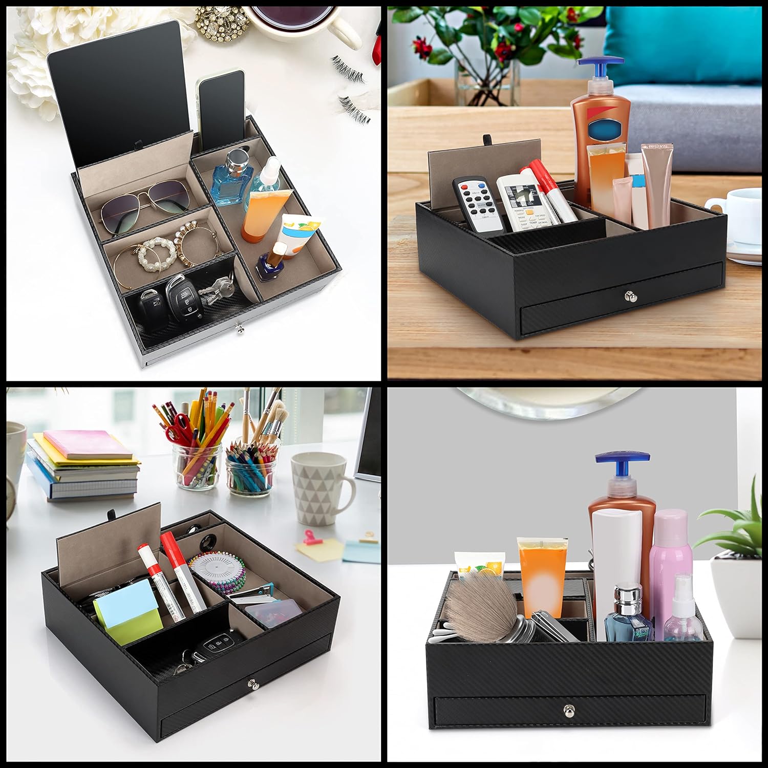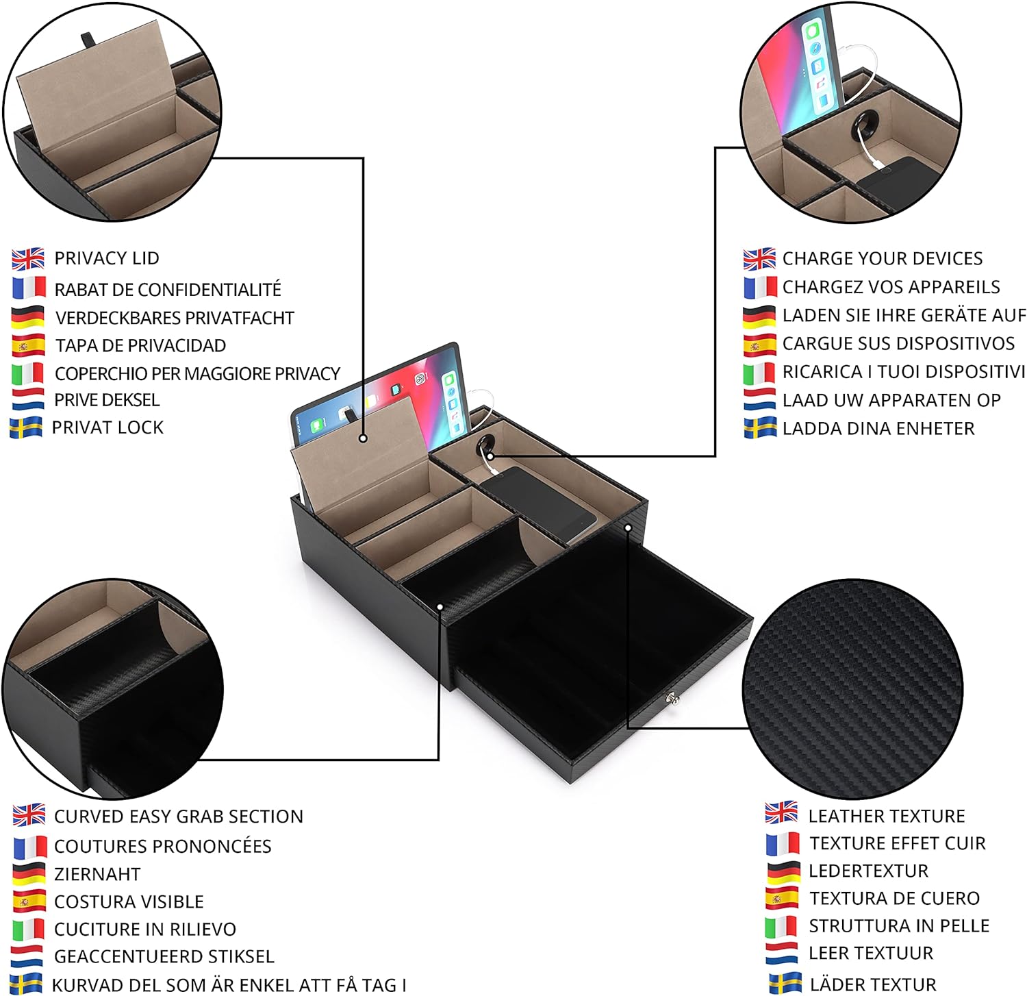 - SCHWARZE SCHLÜSSEL ABLAGE: Unser schwarzes Kunstleder Tablett misst L28 x B26,4 x H9 cm und hat insgesamt 5 Fächer mit einer Schublade unten. Der Schlüssel Organizer hat ein dünnes Fach von 26,8 x 2,7 cm, ein Fach mit Deckel von 15,4 x 6,8 cm, ein