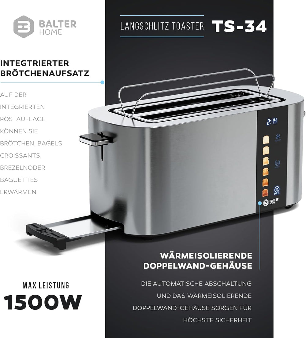 Balter Toaster 4 Scheiben, Touch Bedienung, Langschlitz, Edelstahl, Brötchenaufsatz, LCD Display Lan