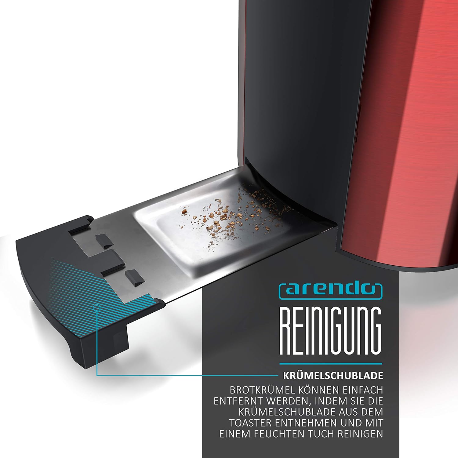 - Abmessungen (ohne Brötchenaufsatz), H x B x L: 19,5 x 38,5 x 19 cm | Netzkabel-Länge: 88 cm /Kabeldurchmesser: 6 mm | Gewicht: 2777g | Material: Kunststoff und gebürsteter Edelstahl | Lieferumfang: Arendo Frukost 4-Scheiben-Edelstahl