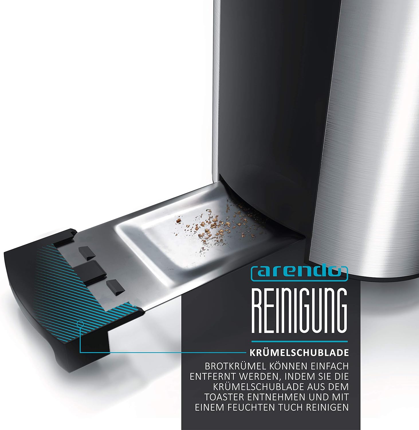 - Abmessungen (ohne Brötchenaufsatz), H x B x L: 19,5 x 38,5 x 19 cm | Netzkabel-Länge: 88 cm /Kabeldurchmesser: 6 mm | Gewicht: g | Material: Kunststoff und gebürsteter Edelstahl | Lieferumfang: Arendo Frukost 4-Scheiben-Edelstahl Langschlitz-Toaster + Bedienungsanleitung (GER)