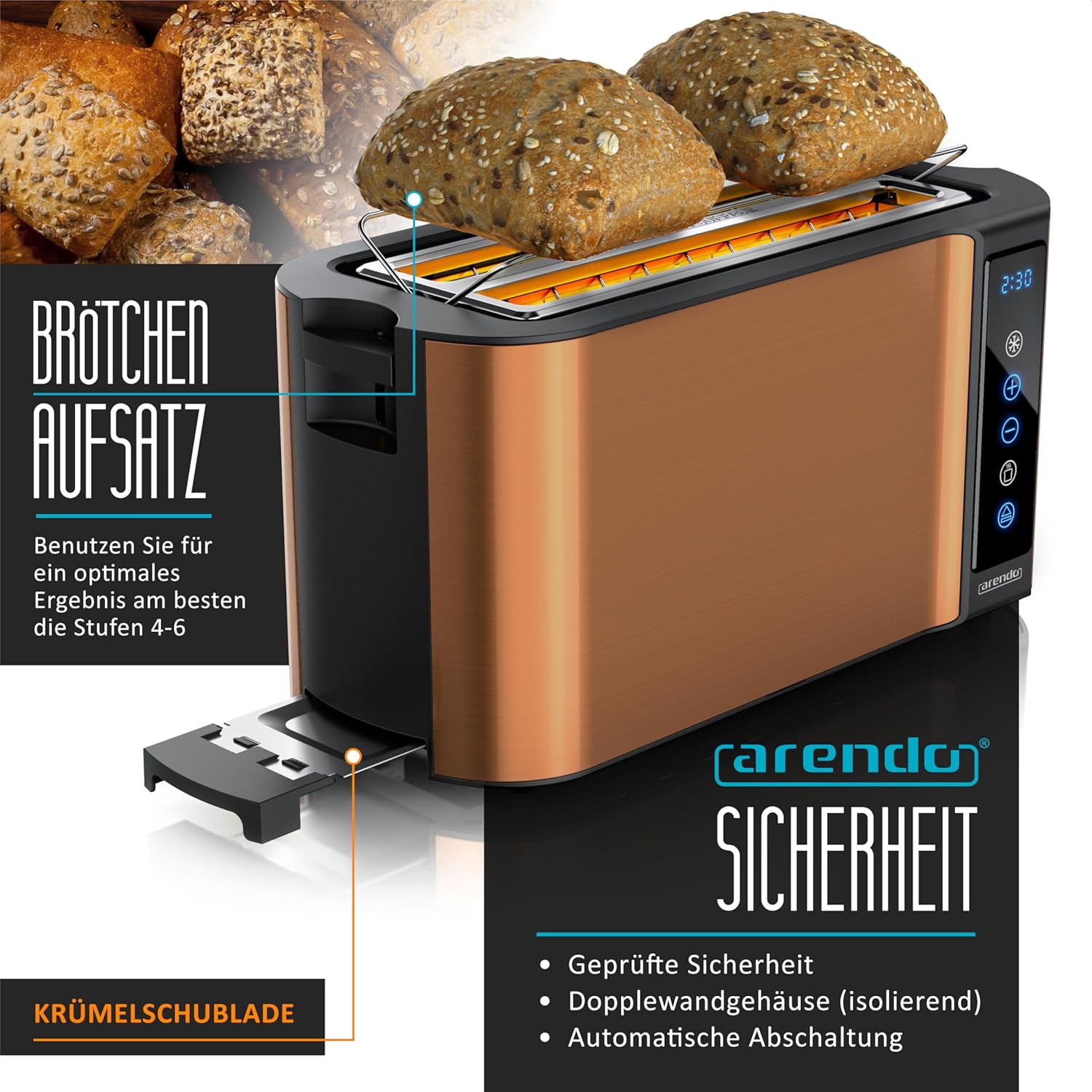 - ABMESSUNGEN (ohne Brötchenaufsatz): H x B x L: 19,5 x 38 x 17 cm | Netzkabel-Länge: 95 cm /Kabeldurchmesser: 6 mm | GEWICHT: 1959 g | Material: Kunststoff und gebürsteter Edelstahl | LIEFERUMFANG: Arendo 4-Scheiben-Langschlitz-Toaster mit Touchpanel +