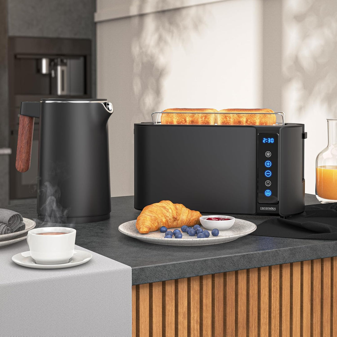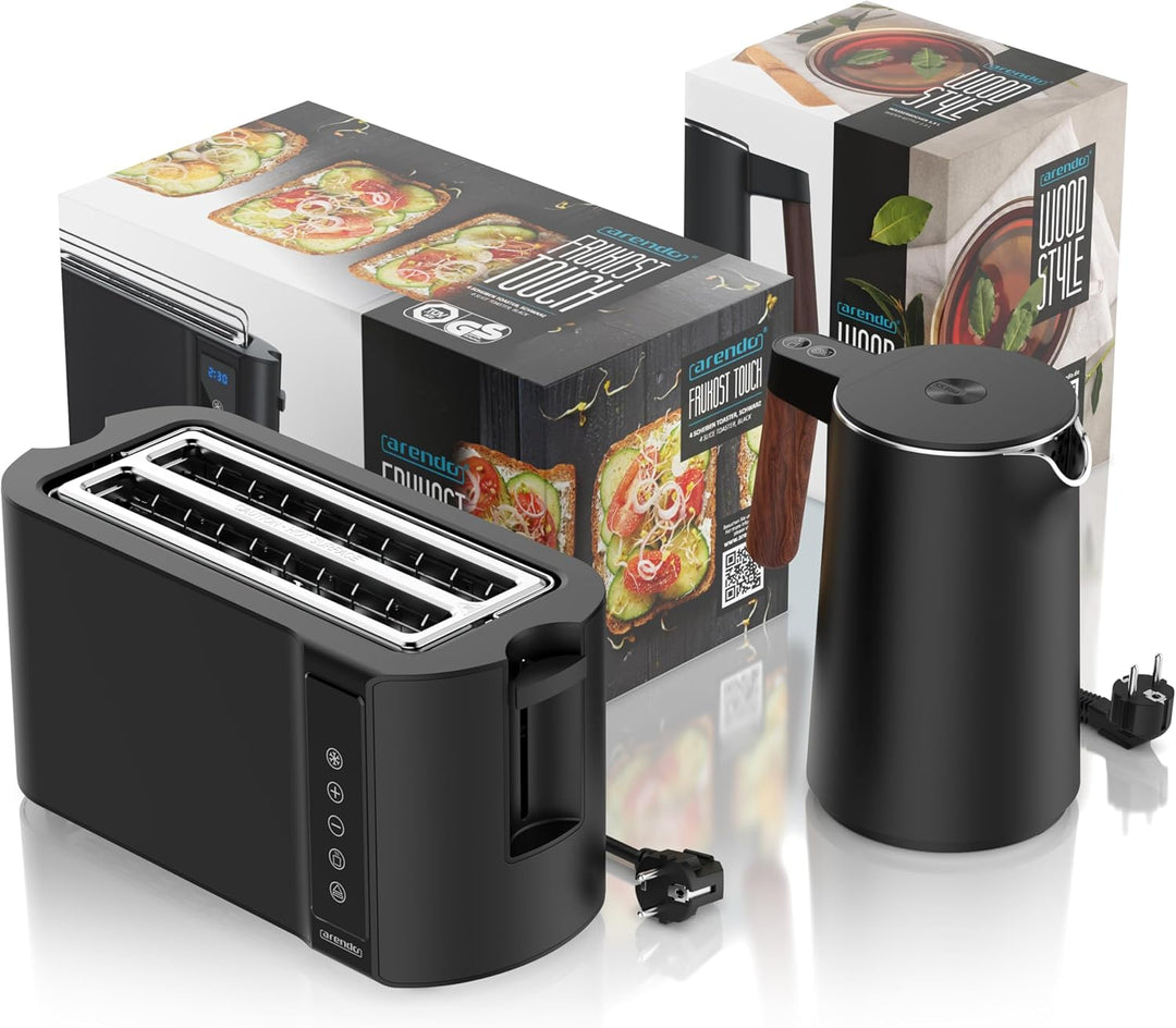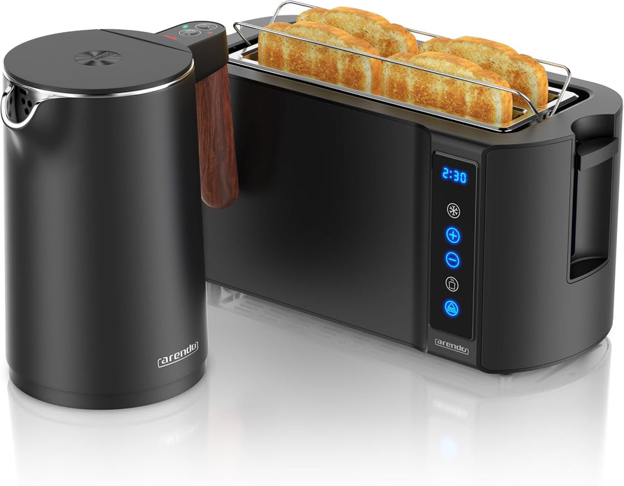 - LIEFERUMFANG: Arendo 4-Scheiben-Doppel-Langschlitz-Toaster FRUKOST TOUCH + Wasserkocher WOOD STYLE mit Bedienungsanleitungen