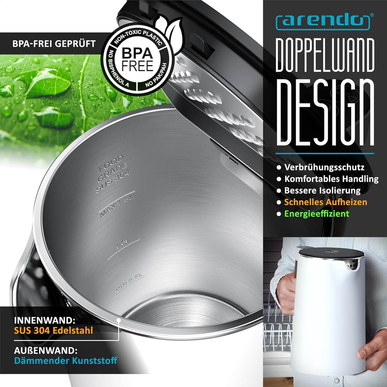 - MODERNER EDELSTAHL-WASSERKOCHER IM STILVOLLEN DESIGN. Ausstattung: 2200 Watt | 7 Temperaturstufen von 45°C bis 100°C, LED Display, Doppelwanddesign, SUS 304 Edelstahl | Interne Wasserstandsanzeige | Verdecktes Heizelement | 360°-Basis |