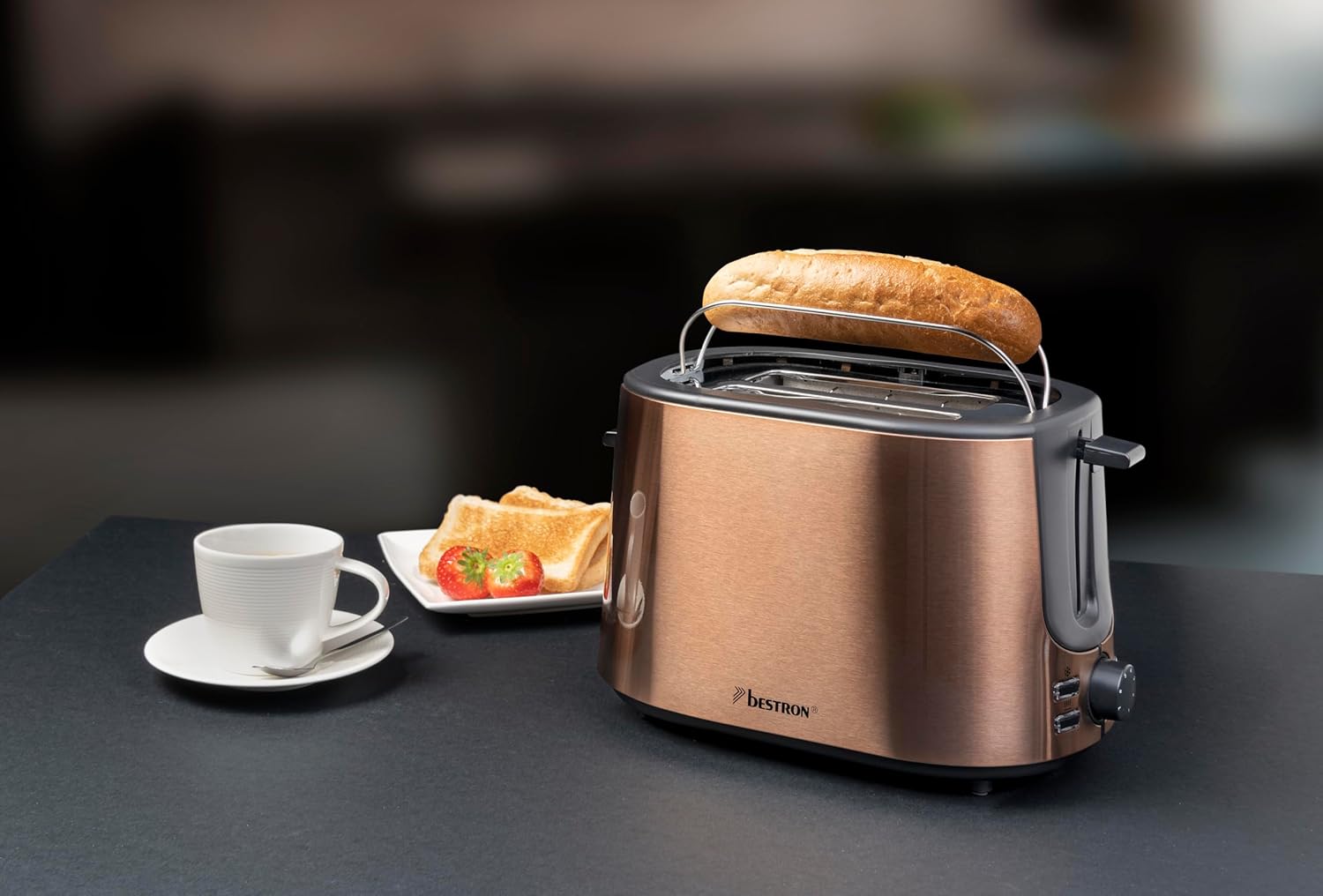 - Lieferumfang: 1 Bestron Toaster, Leistung: 1.000 Watt, BxTxH: 16,5x29x18cm, Gewicht: 1,23 kg, Material: Edelstahl, Kunststoff, Farbe: Kupfer, ATS1000CO