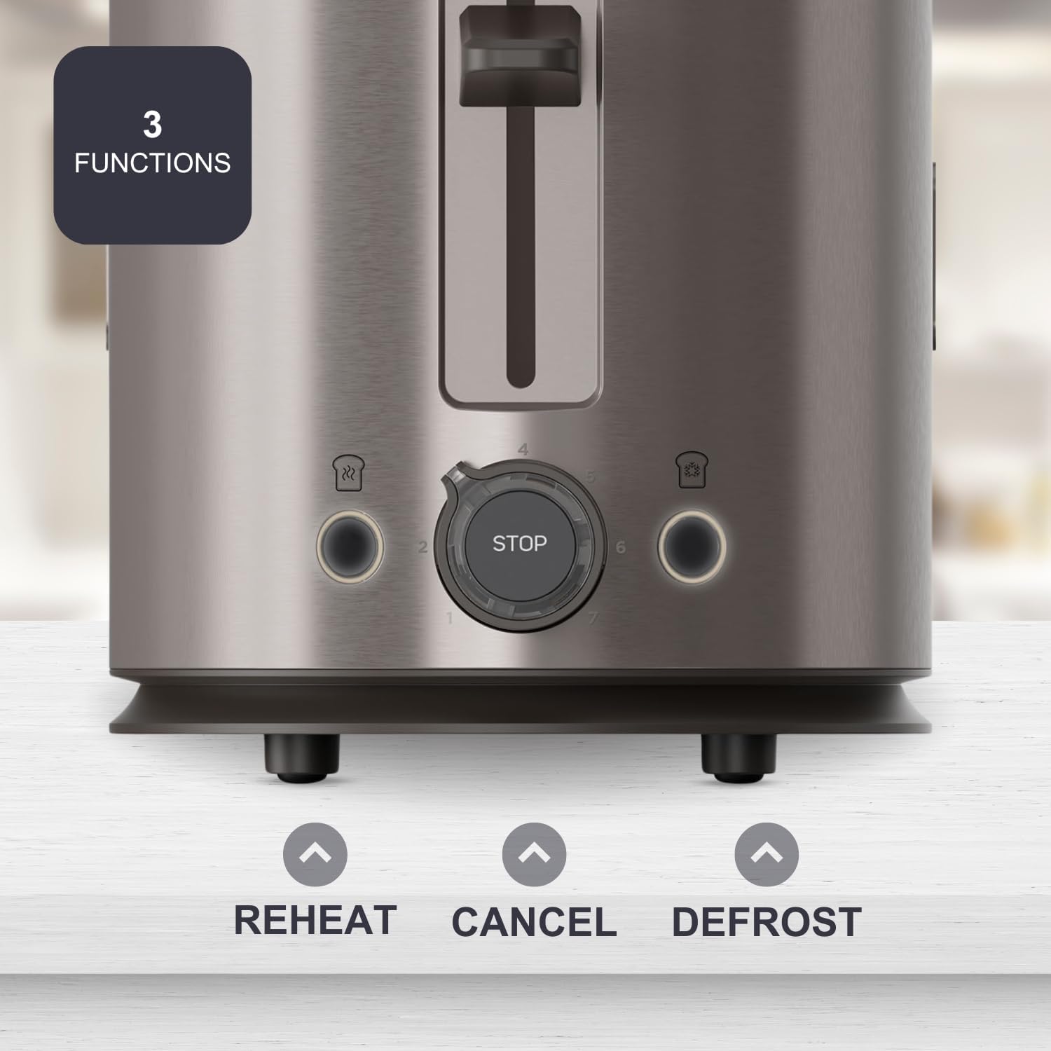 - 【VIELSEITIGE FUNKTIONEN】Mit drei voreingestellten Funktionen – Auftauen, Aufwärmen und Abbrechen – passt sich der Toaster jedem Bedarf an. So können Sie gefrorenes Brot direkt rösten, kalte Toasts wieder aufwärmen oder den Vorgang jederzeit