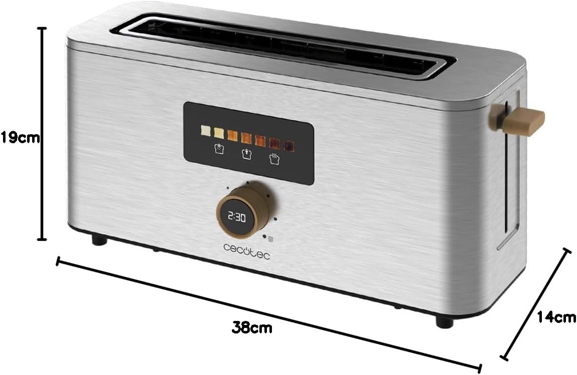 - Ihre breite Schlitze, geeignet für dicke Brote von bis zu 3,8 cm, gewährleisten eine perfekte Bräunung auf jeder Scheibe.