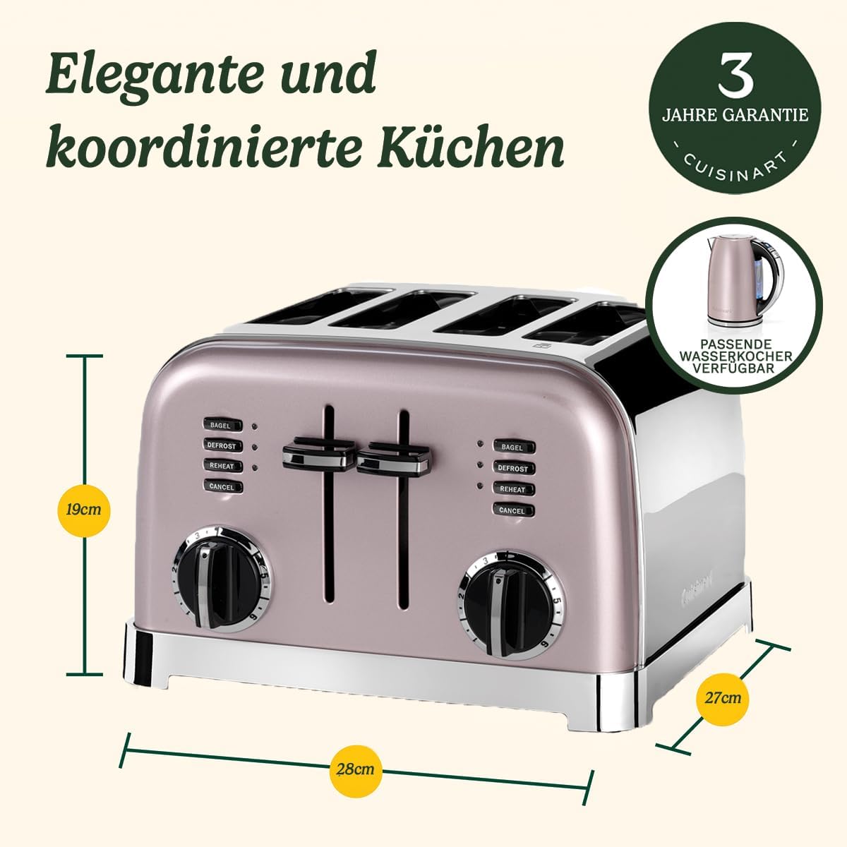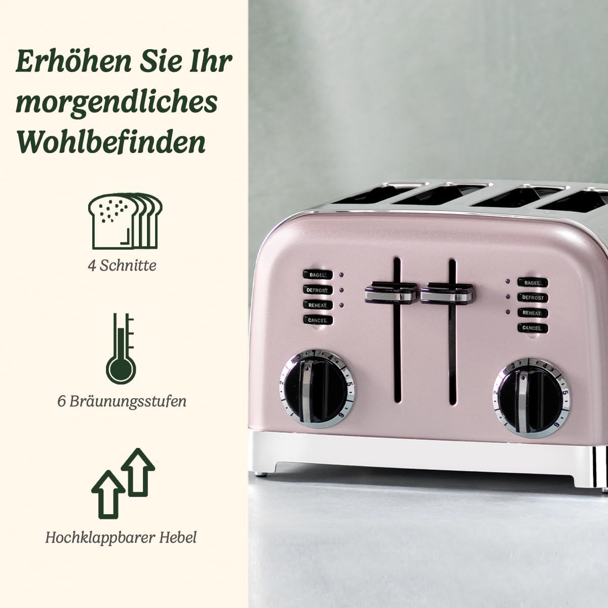 - Stilvoller 4-Schlitz-Toaster mit pastell-rosanem Finish und polierten Chrom-Details