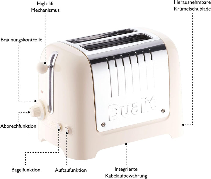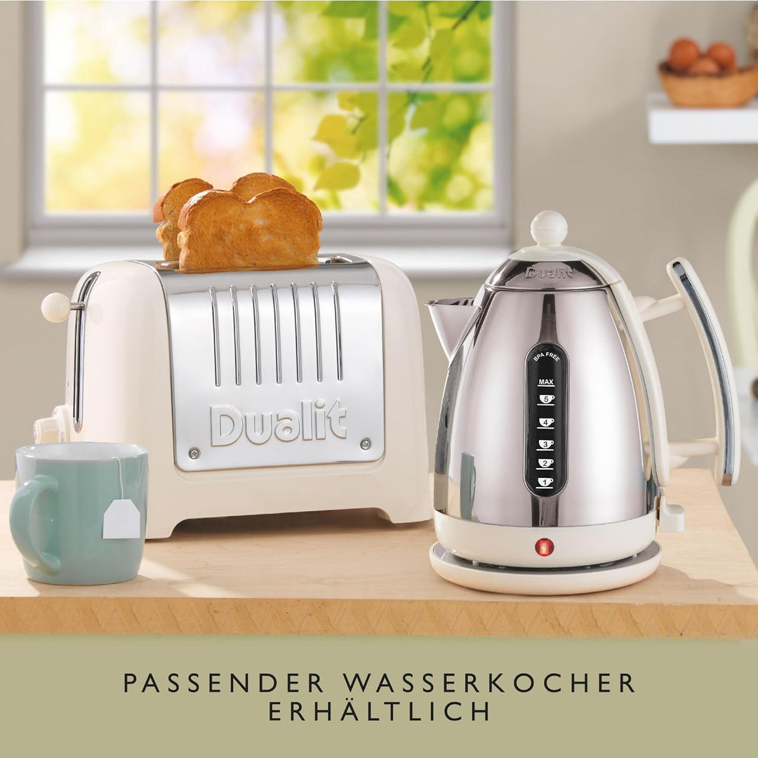 - BAGEL & AUFTAU FUNKTION: Der Toaster 2 scheiben im vintage stil verfügt über eine auftau-funktion, eine mechanische auswahl der bräunungsstärke, ein krümelauffangblech, das leicht entfernt & die eigenen speziellen elemente aller Dualit Toaster. Wenn