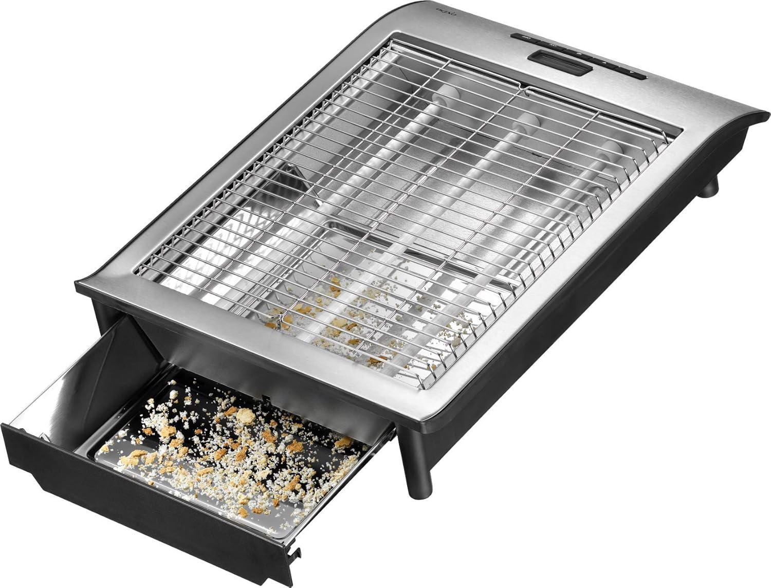 - Flachtoaster ist leicht zu reinigen, einfach die Krümelschublade herausziehen und aufgefangene Krümel entleeren