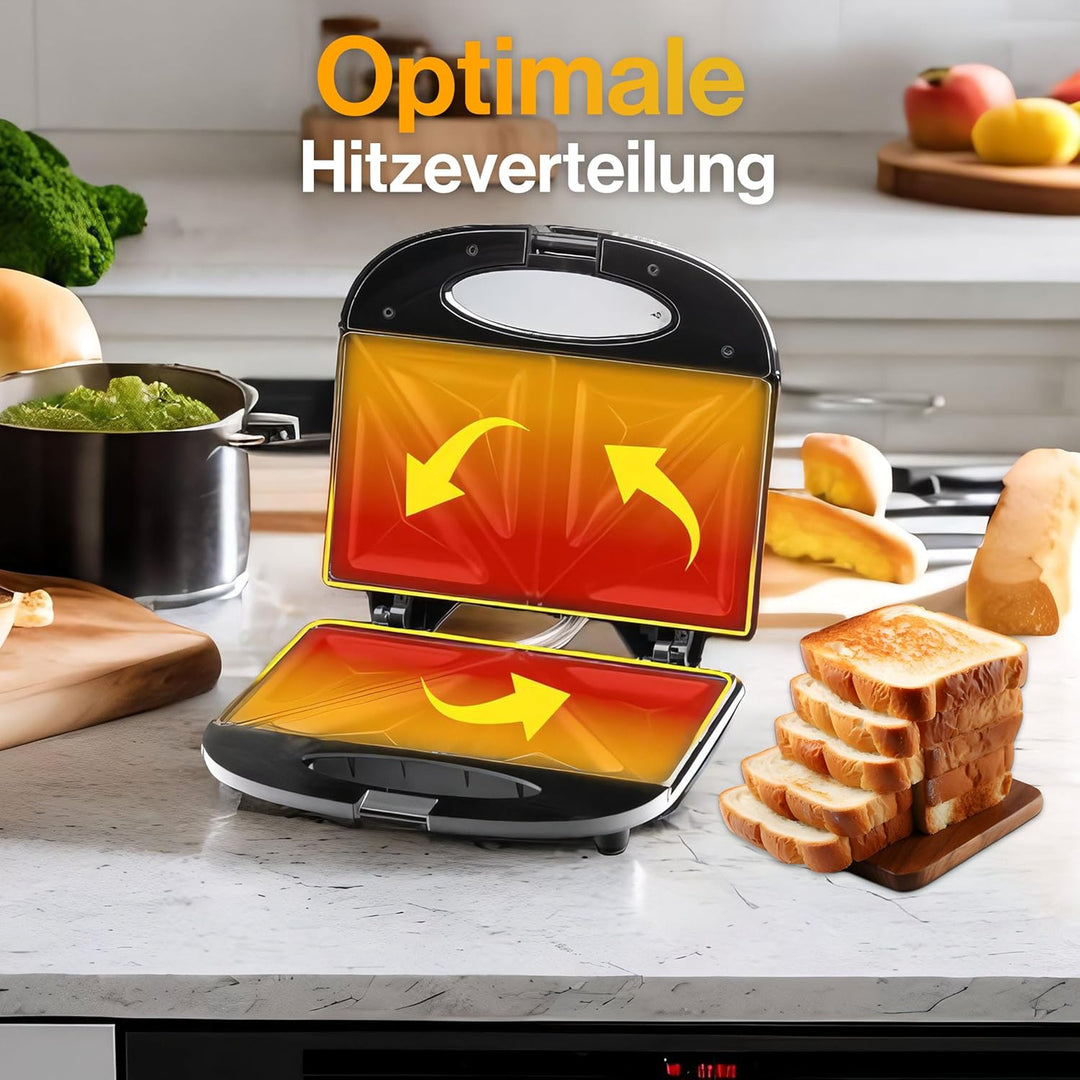 - Kraftvoll & Schnell: Mit einer Leistung von 800 W garantiert der Sandwich-Toaster schnelle Aufheizzeiten und gleichmässige Hitzeverteilung für perfekt getoastete Sandwiches.