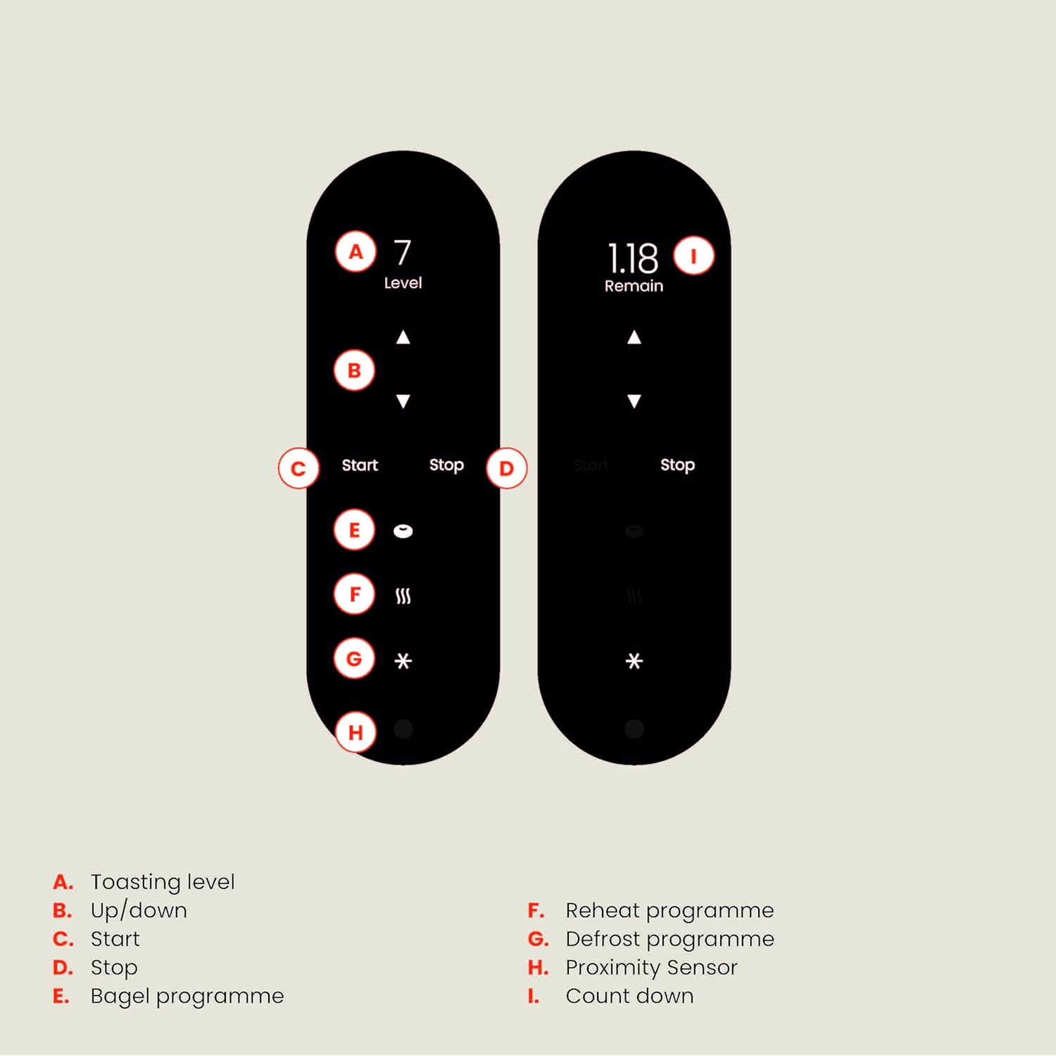 - Intelligente Benutzeroberfläche – Bewegungsaktiviertes Display zeigt verbleibende Toastzeit, dimmt sich automatisch, wenn nicht in Gebrauch – für ein ruhiges Erscheinungsbild.