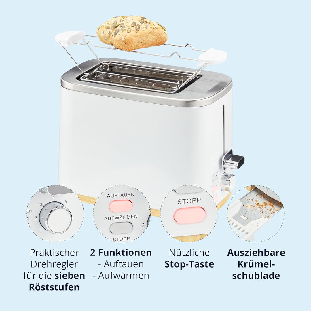 - [Stilvoll] Der Toaster besticht durch seinen modernen Look. Das weisse Gehäuse mit Holzapplikation integriert sich Stilvoll in jeder Küche.