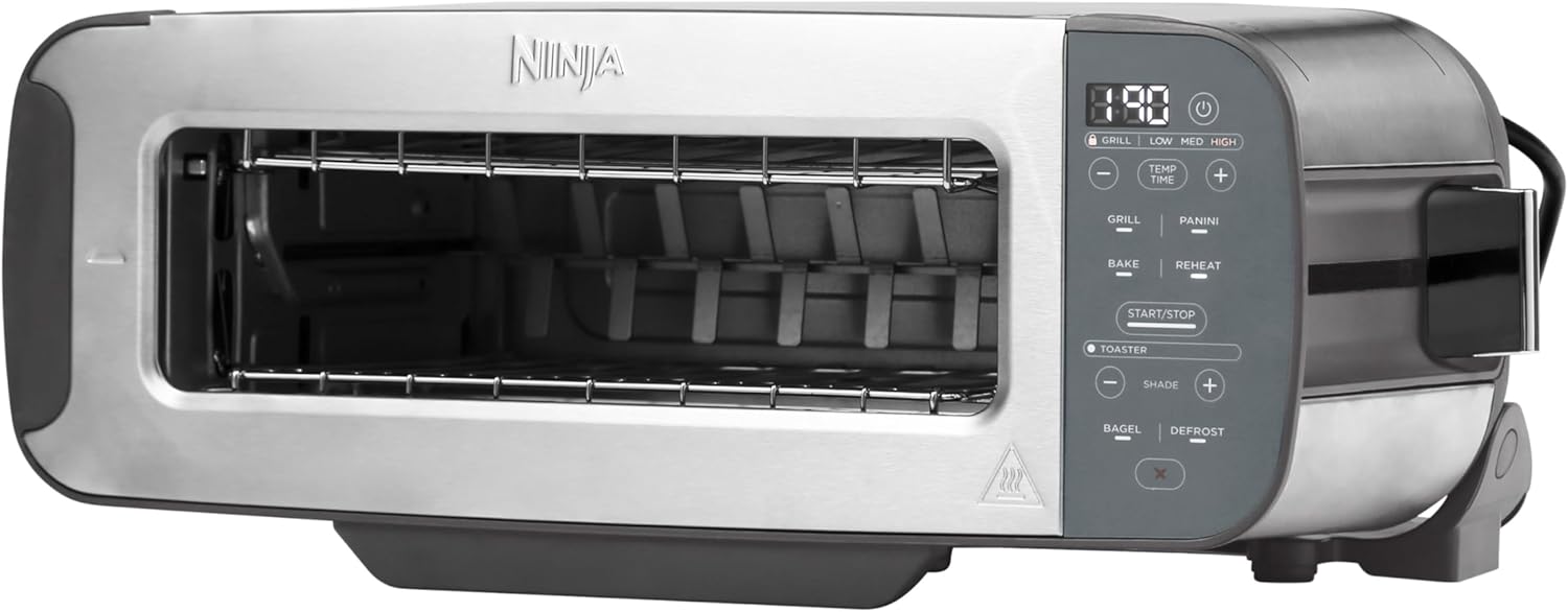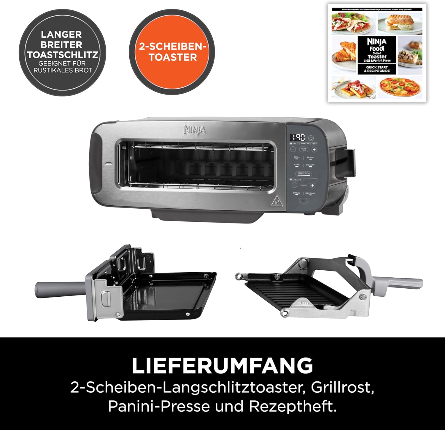 - ENTHÄLT: Ninja Foodi 3-in-1 Toaster (EU-Stecker) Panini-Presse, Backblech, Krümelschale und von Köchen erstellte Rezepte, Farbe: Edelstahl
