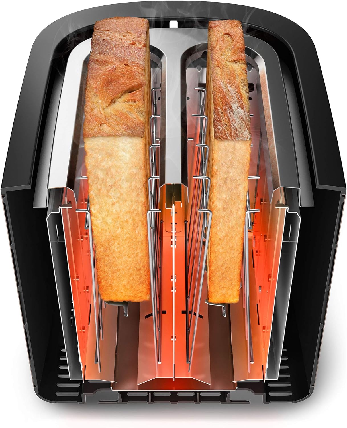 - Extra breite Toastkammern mit Zentrierfunktion für verschiedene Brotsorten (dick oder dünn, frisch oder gefroren)
