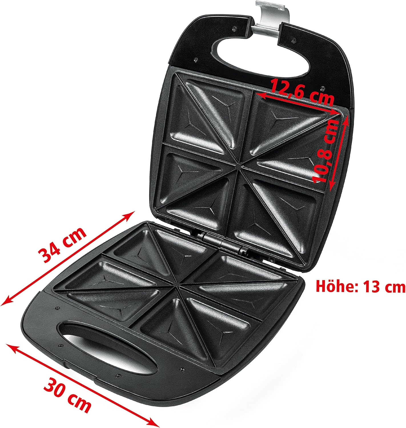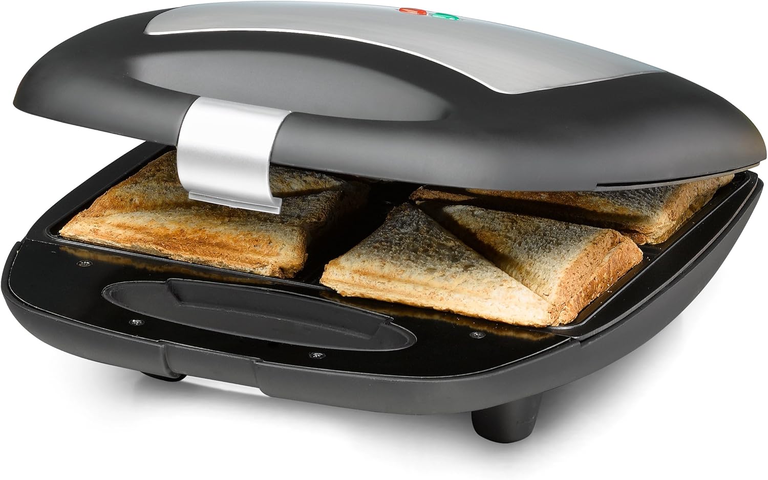 - Produkt 1: für 4 Sandwiches, Gehäuse aus mattiertem Kunststoff und gebürstetem Edelstahl, massive Alu-Druckguss-Toastplatten