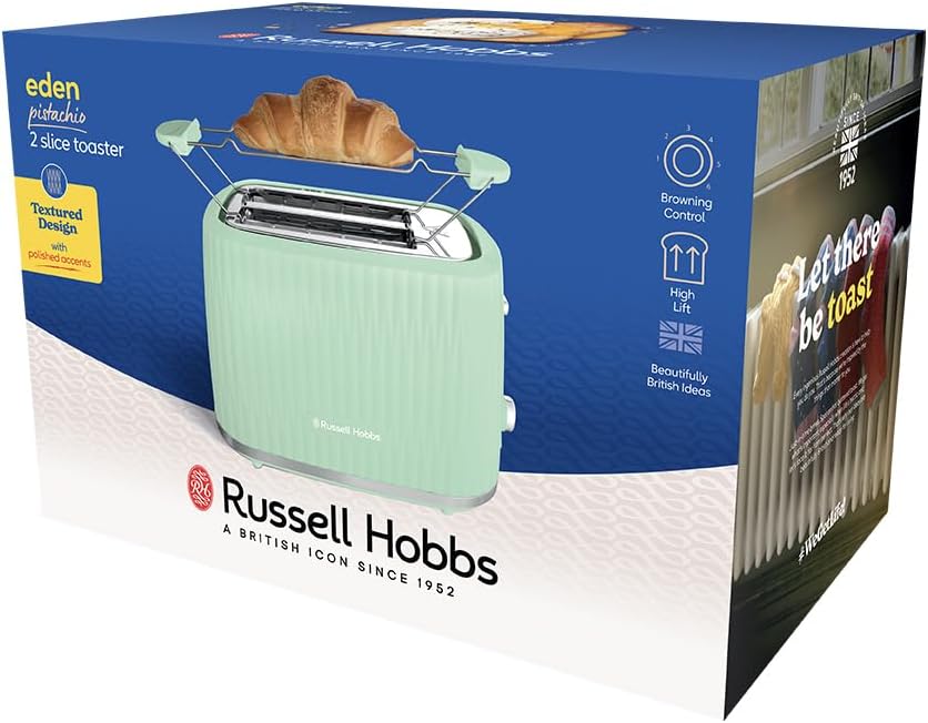 - STILVOLLES DESIGN - Der Russell Hobbs Eden 800W 2-Schlitz-Toaster in der Trendfarbe Pistazie bringt Stil und Funktionalität in deine Küche. Mit seinem stilvollen strukturierten Design und den eleganten Edelstahlakzenten ist er ein echter Hingucker.