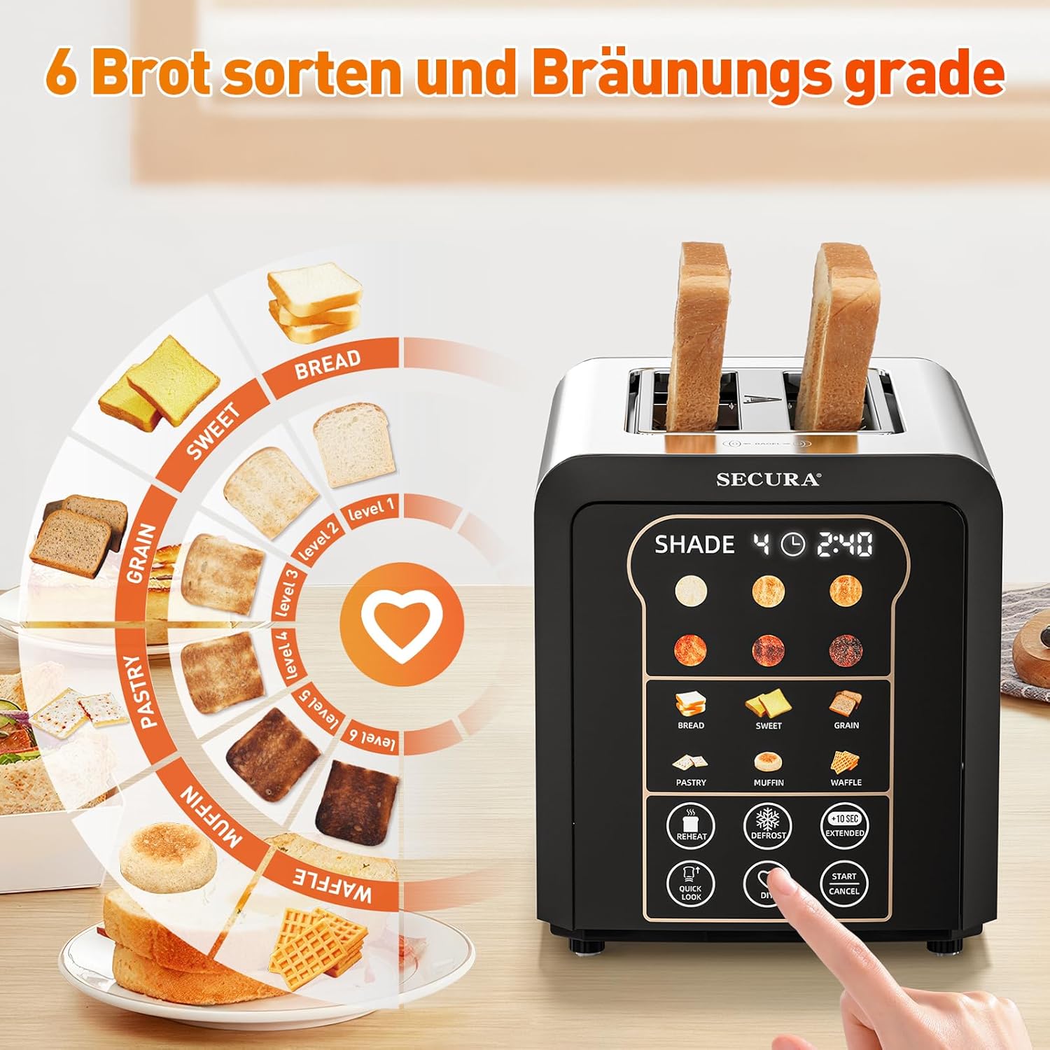 - Automatisches Absenken und Anheben - Der Secura 2-Scheiben-Toaster senkt das Brot zu Beginn automatisch ab und hebt es an, wenn es fertig ist – kein Hebel erforderlich – und sorgt so für freihändiges, nahtloses und präzises Toasten bei jedem Mal