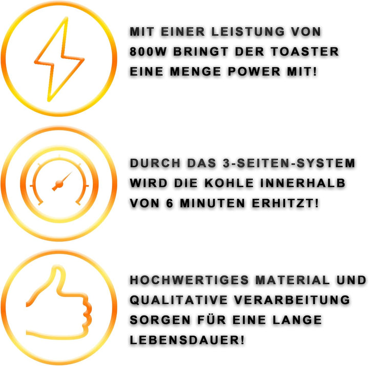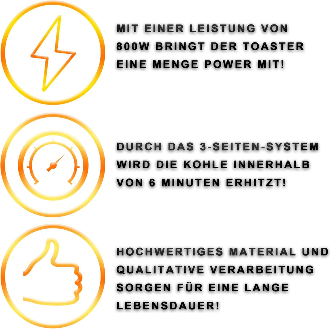 - ⚡ POWER - Mit einer Leistung von 800 Watt bringt der Toaster eine menge Power mit. Diese Power wird durch ein 3-Seitiges-Hitzesystem umgesetzt und somit können bis zu 6 Kohlewürfel mit jeweils einer Kantenlänge von 26 mm gleichzeitg erhitzt werden!