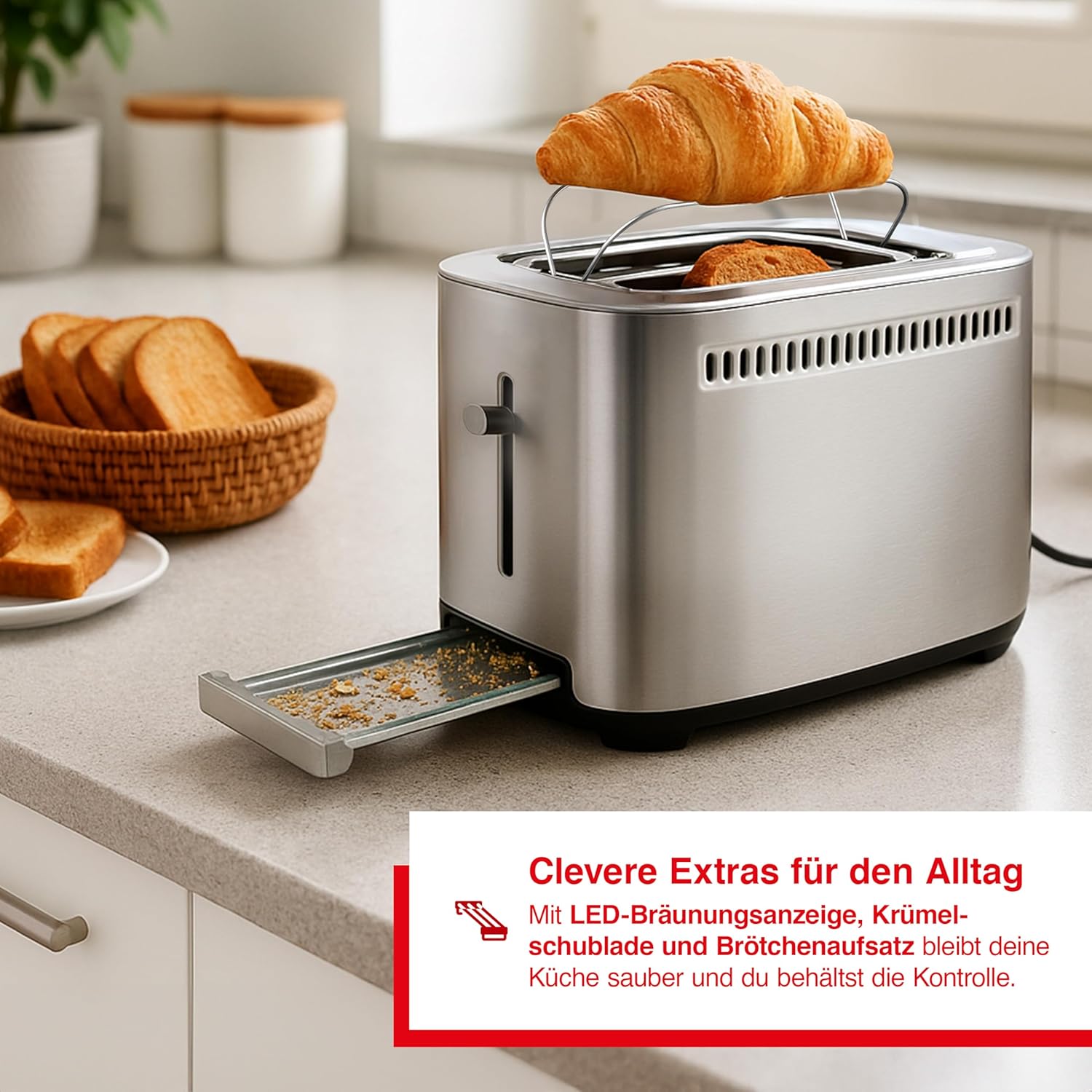 - SCHUBLADE FÜR BROTKRUMMEN - Der Toaster hat eine Schublade für Brotkrümel. Die Schublade fängt alle Brotkrümel auf und ist leicht zu leeren. Sie können die Schublade in der Spülmaschine reinigen.