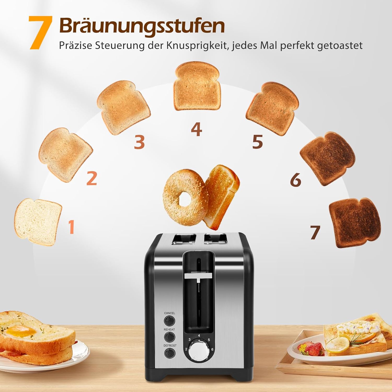 - 7 Bräunungsstufen: Geniessen Sie eine Vielzahl von Toastoptionen dank mehrfacher Bräunungseinstellungen, die 7 Bräunungsstufen von der leichtesten bis zur dunkelsten liefern, von leicht warm bis dunkel und knusprig, um die Vorlieben aller zu
