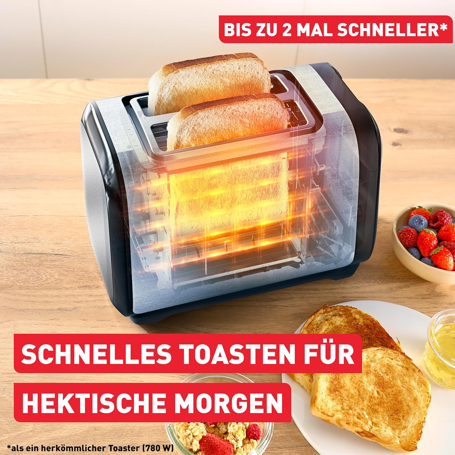 - Schnelles Toasten für hektische Morgen: Bis zu 50% schneller als ein normaler Toaster (780 W) dank 1200 W Leistung plus 7 Bräunungsstufen – von leicht gebräunt bis extra knusprig – sorgen für perfekt getoastete Ergebnisse, genau wie Sie es mögen