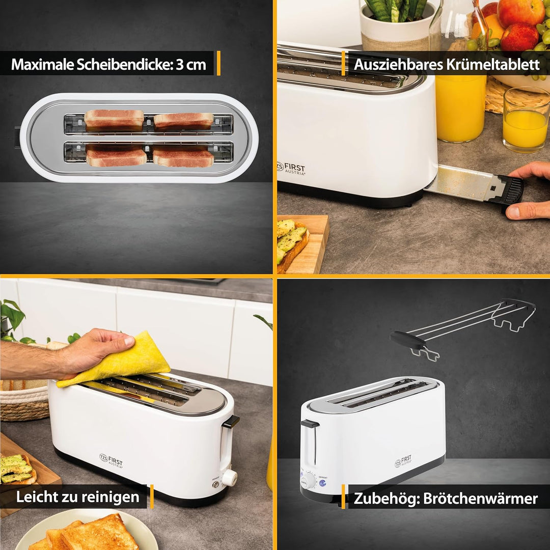 - LEISTUNGSSTARK + EFFEKTIV: Der XL-Toaster mit zwei langen Röstschlitzen versorgt gleich mehrere Personen in einem Zug. Sehr alltagsdienlich: Brotreste landen in der integrierten Krümelschale, somit ist eine einfache Reinigung gegeben sowie der