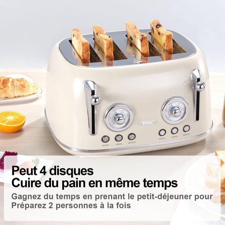 - Wiltal Retro Toaster ist mit 4 verbreiterten Toasterschlitzen (3,8 cm x 14 cm x 14 cm) zum Toasten einer Vielzahl von dünnen und dicken Broten ausgestattet. Solide Struktur und zuverlässige Qualität. Geniessen Sie ein leckeres Frühstück zu Hause mit Toast, geschnittenem Brot, Sandwich-Schnitten, Waffeln und mehr.