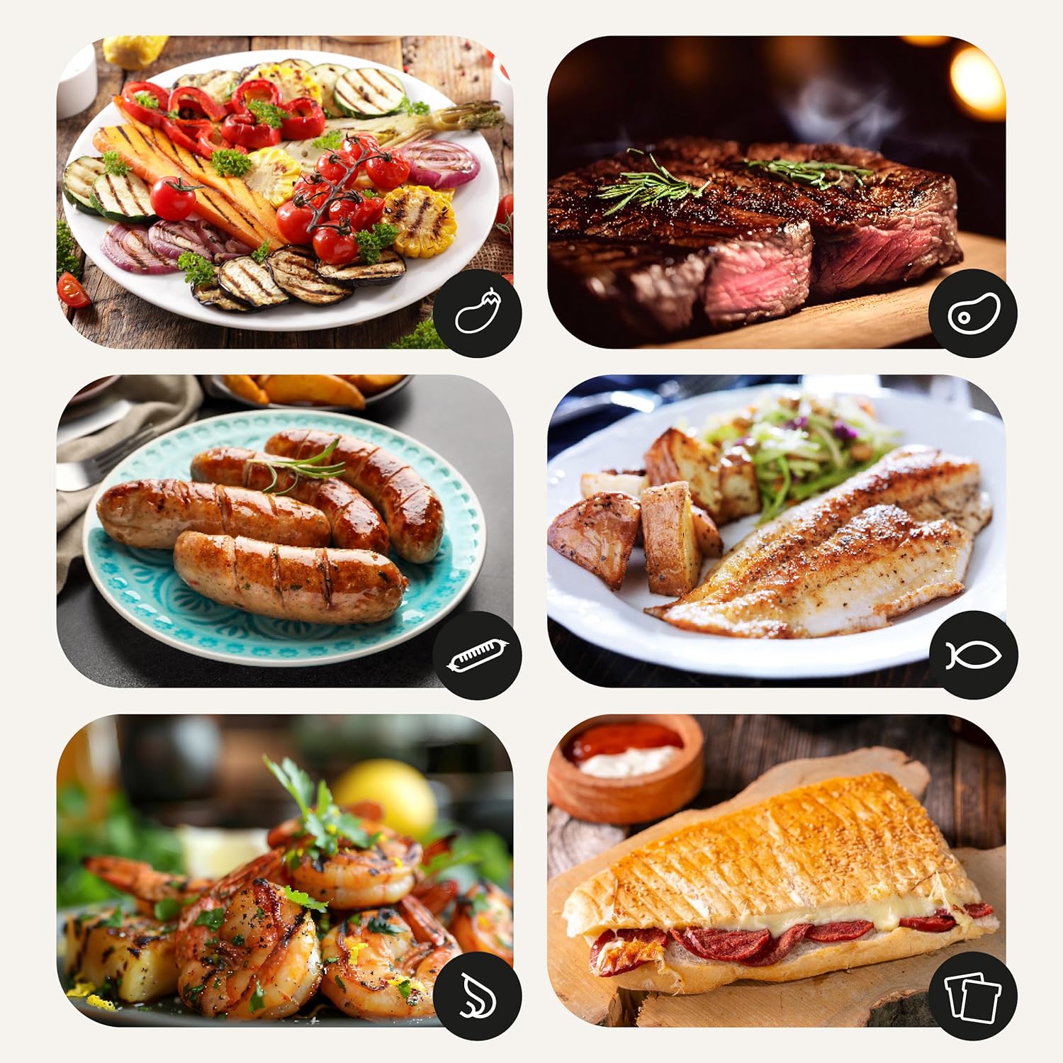 - EINSTELLUNG DES ABSTANDES DER PLATTEN: Durch die Einstellung des Abstandes zwischen den Platten passt sich der Grill an die Dicke des Grillgutes an, für dünnere oder dickere Fleischstücke oder Steaks, aber auch für Gemüse, Paninis oder Toast, für