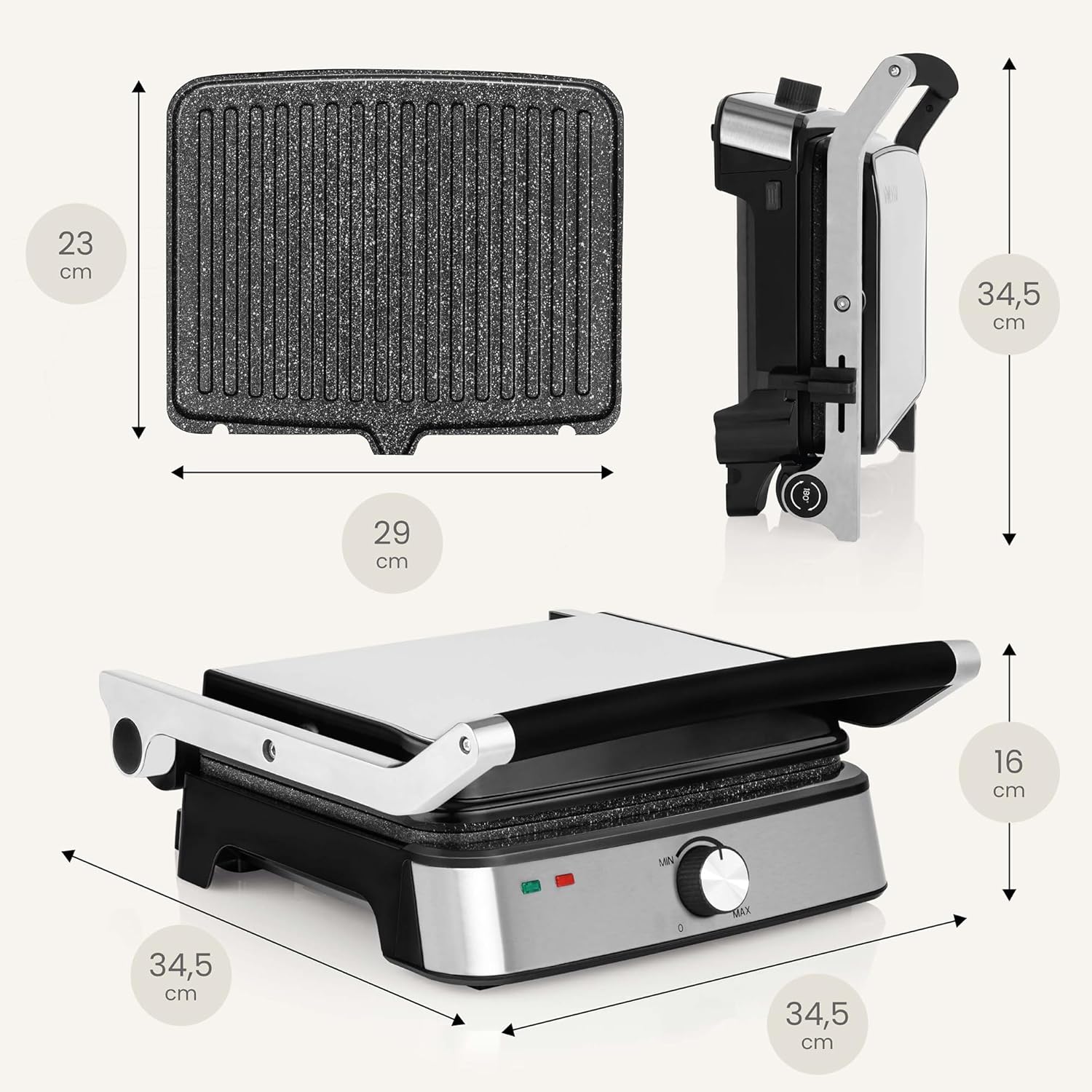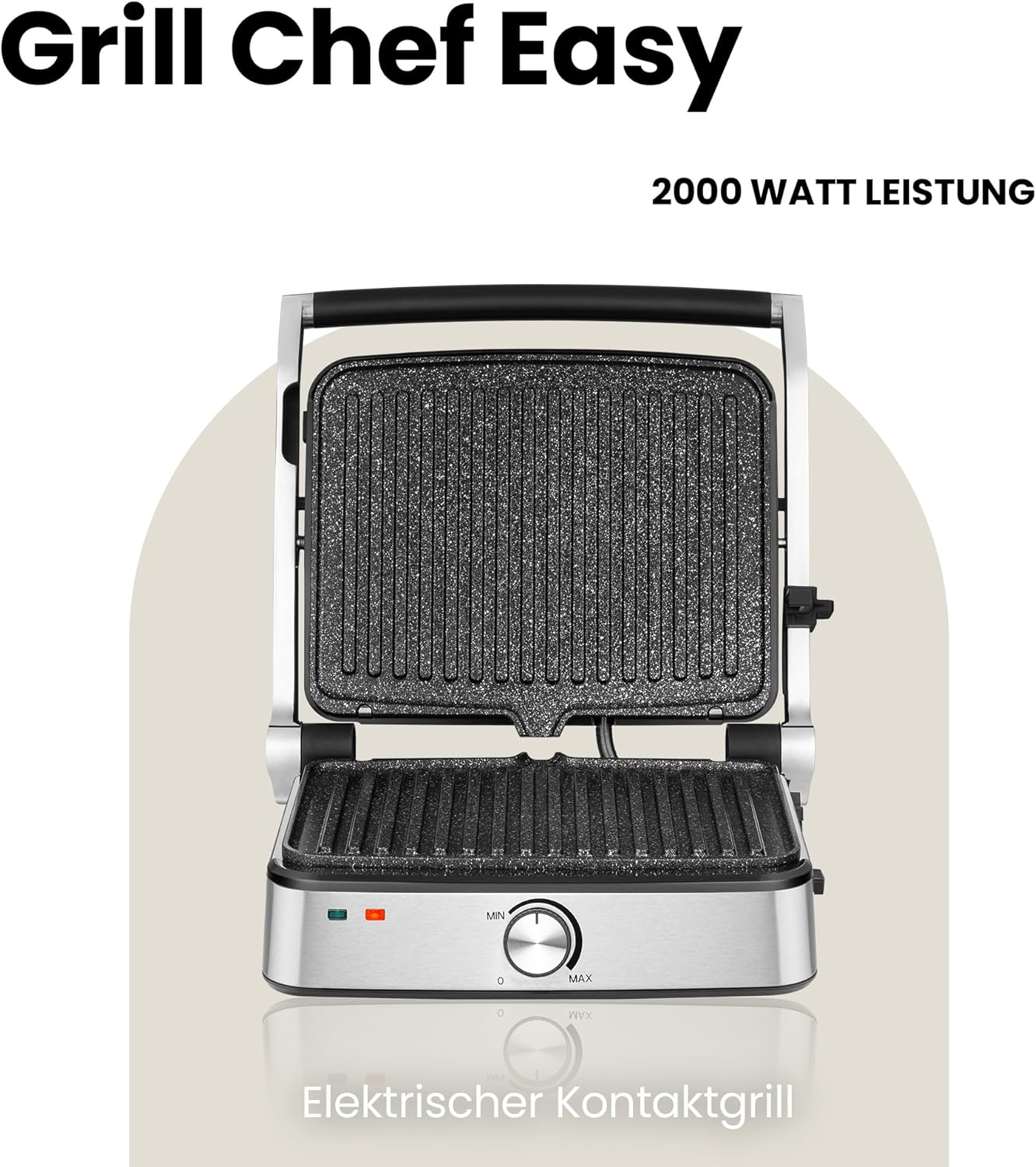 - GRILL CHEF EASY 2-in-1: Dank der 2-in-1-Option kann das Gerät sowohl als Elektrogrill als auch als Toaster verwendet werden. Die Möglichkeit, den Grill auf 180° zu öffnen, bietet eine grosse Grillfläche von 1345 cm², ideal für grössere Treffen