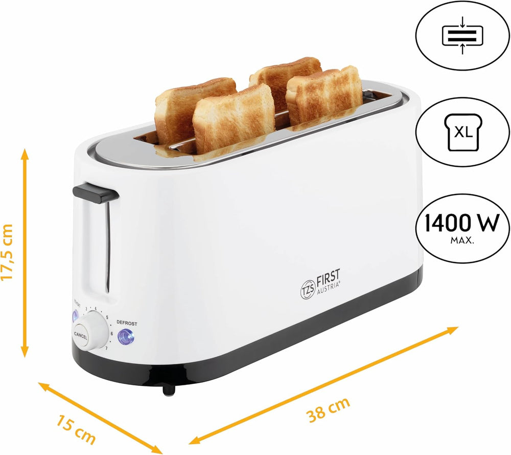 TZS First Austria - Toaster 4 Scheiben Langschlitz 1400W mit Krümelschublade | Brötchenaufsatz | wär