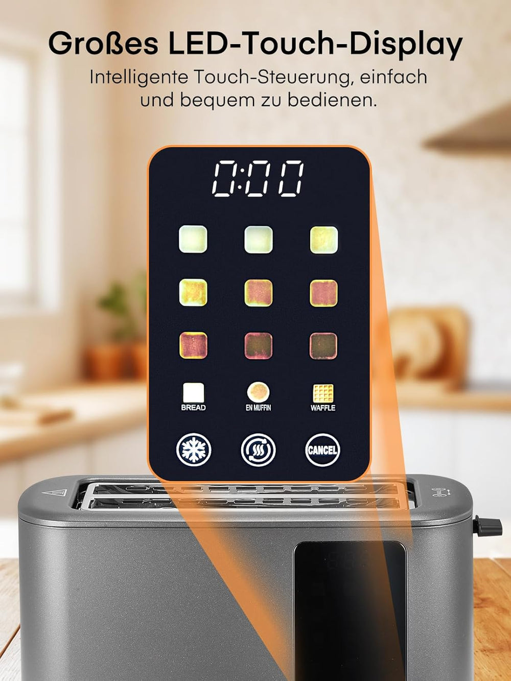 Balter Toaster 4 Scheiben, Touch Bedienung, Langschlitz, Edelstahl, Brötchenaufsatz, LCD Display Lan
