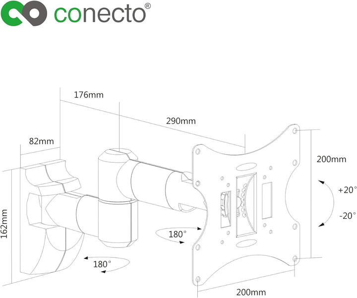 - Mit einem Wandabstand zwischen 10-47cm und einer maximalen Traglast von 30,0kg ist die Wandhalterung von conecto auch für Ihr Gerät passend, zusätzlich sorgen die VESA-Masse von 75x75 bis 200x200 (10" bis 42") für einen stabilien Sitz.