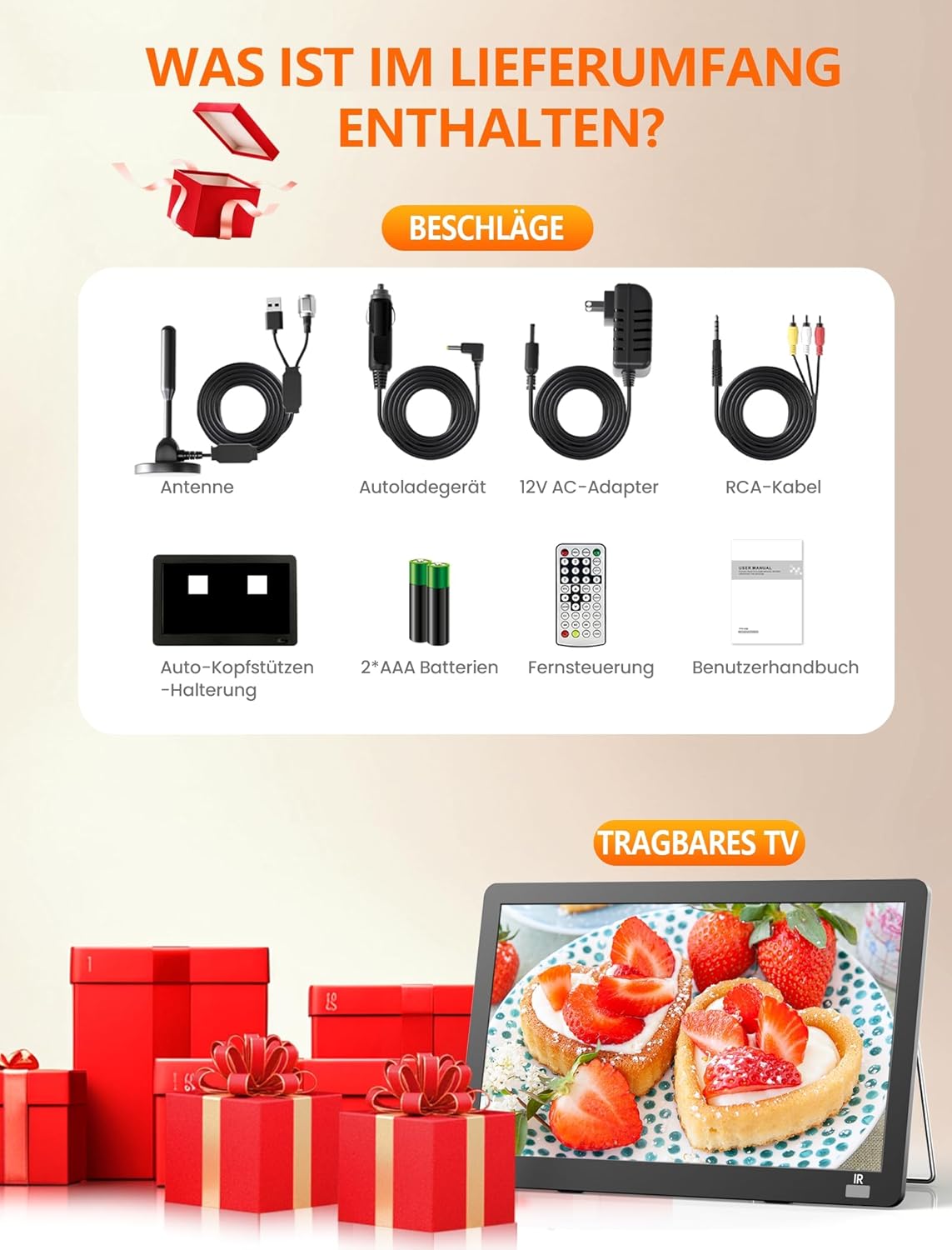 - 【Sie erhalten】Desobry Portable Fernseher, TV Antenne, 12V AC Adapter, Autoladegerät, Fernbedienung, RCA Kabel, Auto-Kopfstützenhalterung, 2*AAA-Batterien und Benutzerhandbuch. DESOBRY konzentriert sich auf Ihre Gefühle, wenn Sie irgendwelche