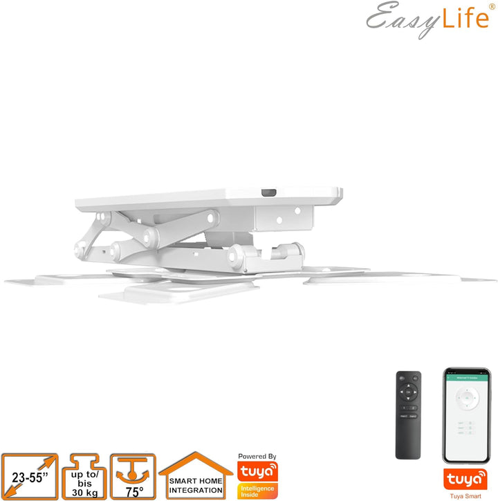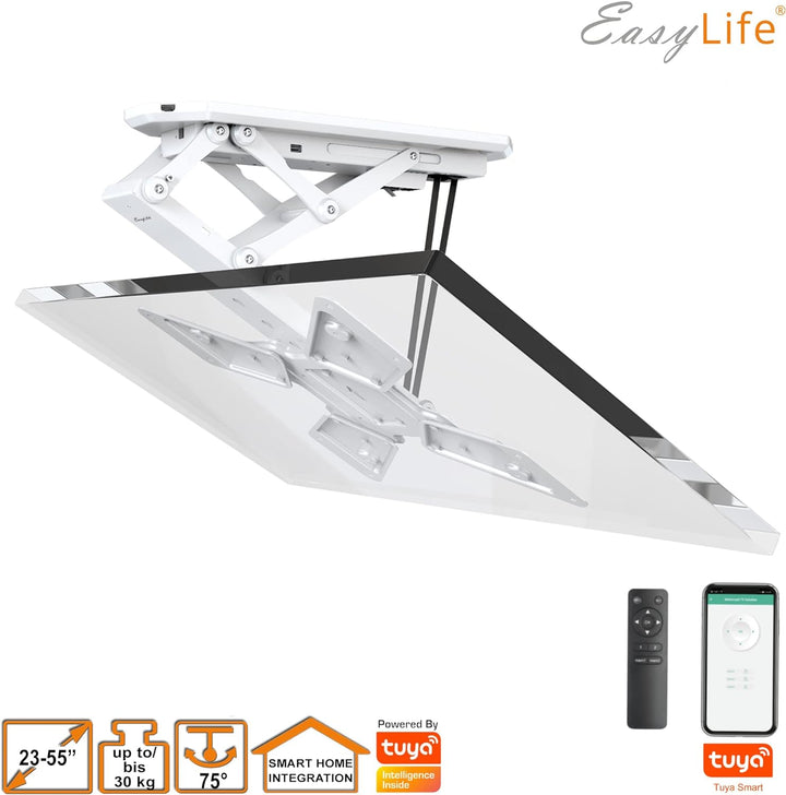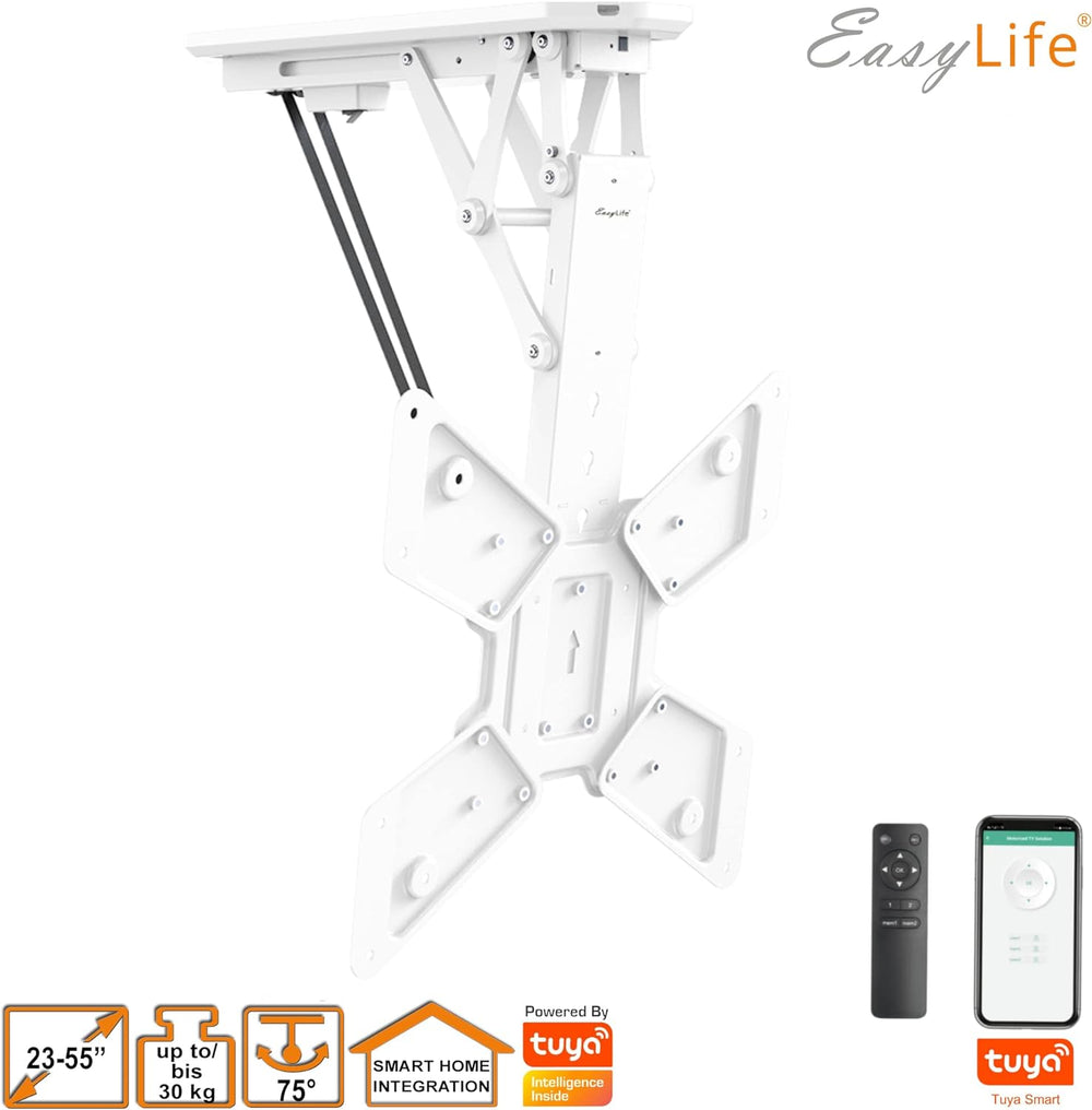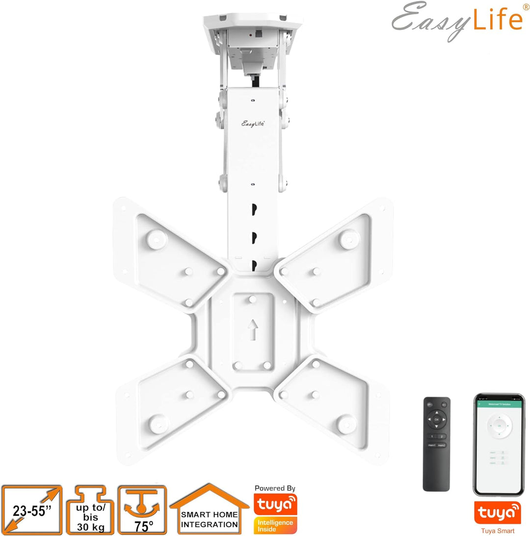 - ✅ LIEFERUMFANG: 1x EasyLife EL-DHM-55W TV Deckenhalterung schwenkbar in Weiss für TV's von 23 bis 55 Zoll (58 bis 140 cm), mit elektrischem Motor und Smart Home Integration, 1x Fernbedienung, 1x Befestigungsmaterial für die Deckenmontage inklusive