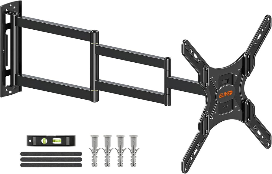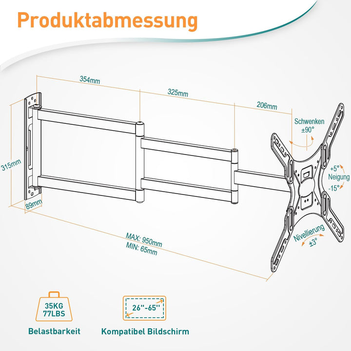 - Langer & doppelt klappbarer Arm: Diese Wandhalterung lässt sich um 950mm ausfahren und um 65mm zurückziehen, was viel Platz spart. Der zweifach klappbare Arm ist flexibler und ermöglicht den Blick zwischen den Räumen.