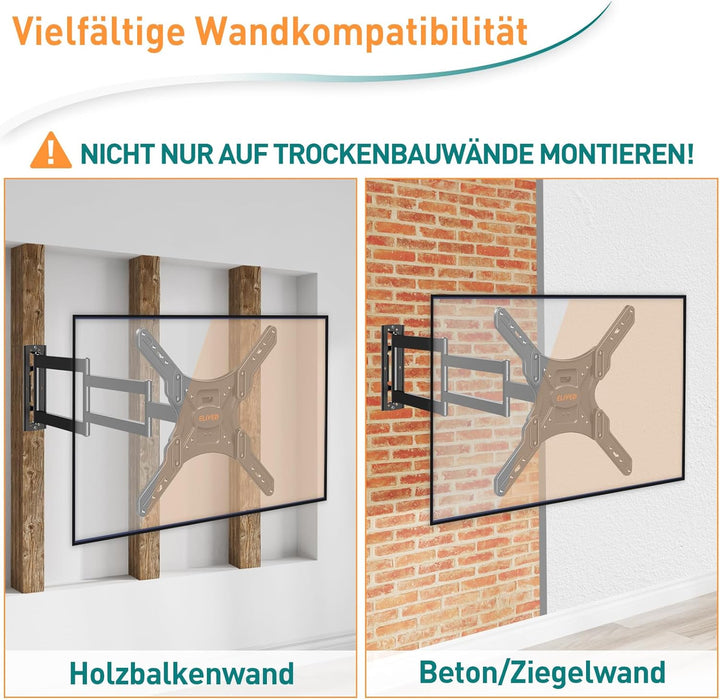 - Vollbewegliche TV Wandhalterung: Sie ist um +/-90° schwenkbar, um +5/-15° neigbar und um +/-3° horizontal verstellbar. Sie können den TV-Winkel nach Ihren Bedürfnissen einstellen und das Fernsehen geniessen.