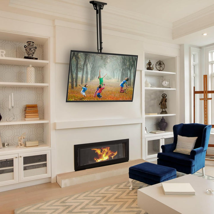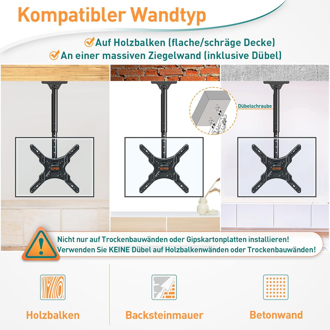 - Anwendbare Szenarien - Diese TV Halterung eignet sich für flache oder schräge Decken, z. B. in Bars, Restaurants, Cafés, Fitnessstudios, Lebensmittelgeschäften, Einkaufszentren, Flughäfen, Krankenhäusern, Schulen und mehr. Dies ist eine