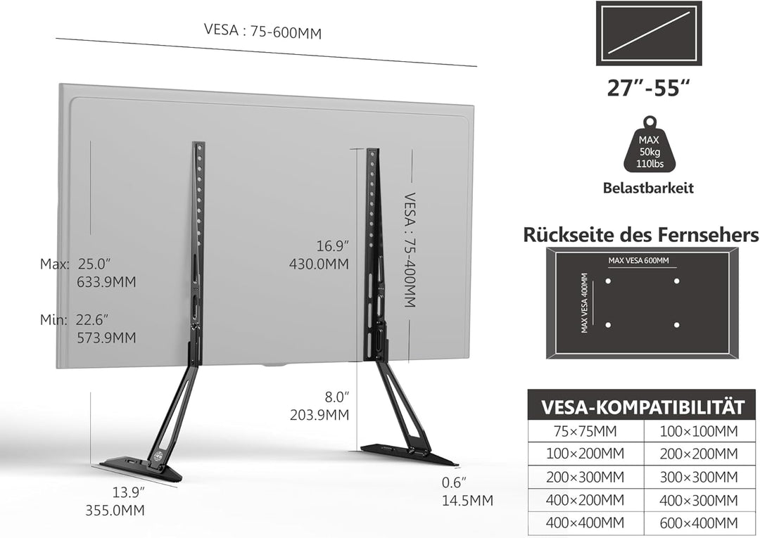 - 【Universal TV Beine】Geeignet für TV-Geräte, PC-Monitore mit Bildschirmdiagonale 32-55 Zoll bis zu 50kg. VESA Modelle 75*75-600*400. Kompatibel mit die meisten TV-Marken. Bitte überprüfen Sie die Grösse, das Gewicht und den VESA ihres Fernsehers