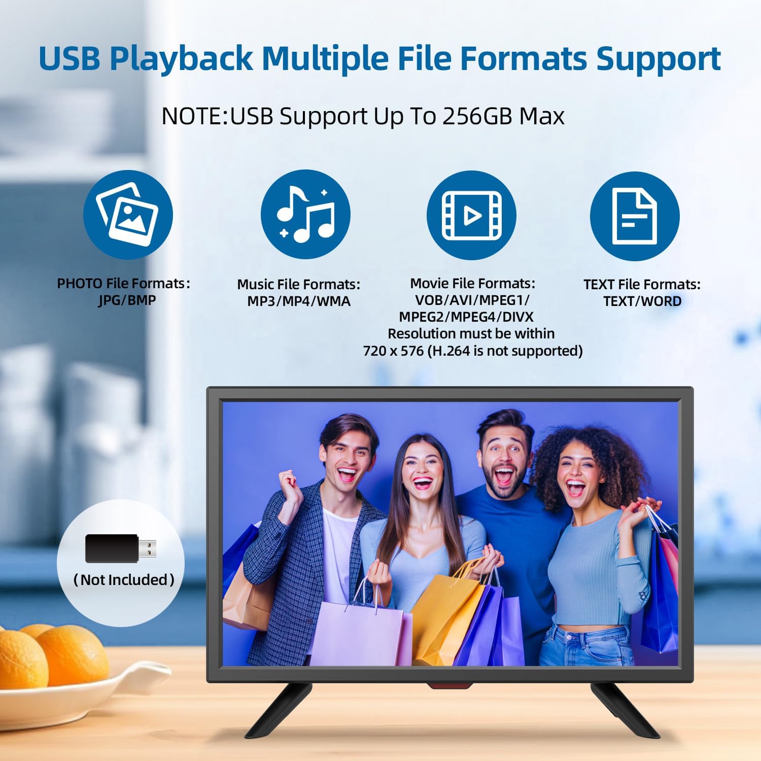 - DVB-T2 digital - Eingebauter DVB-T2 digitaler TV-Tuner, empfängt frei empfangbare HD TV-Sender über die Luft, 20-Zoll-Bildschirm bietet hervorragende Klarheit und satte Farben mit eingebauten Dual-Stereo-Lautsprechern.