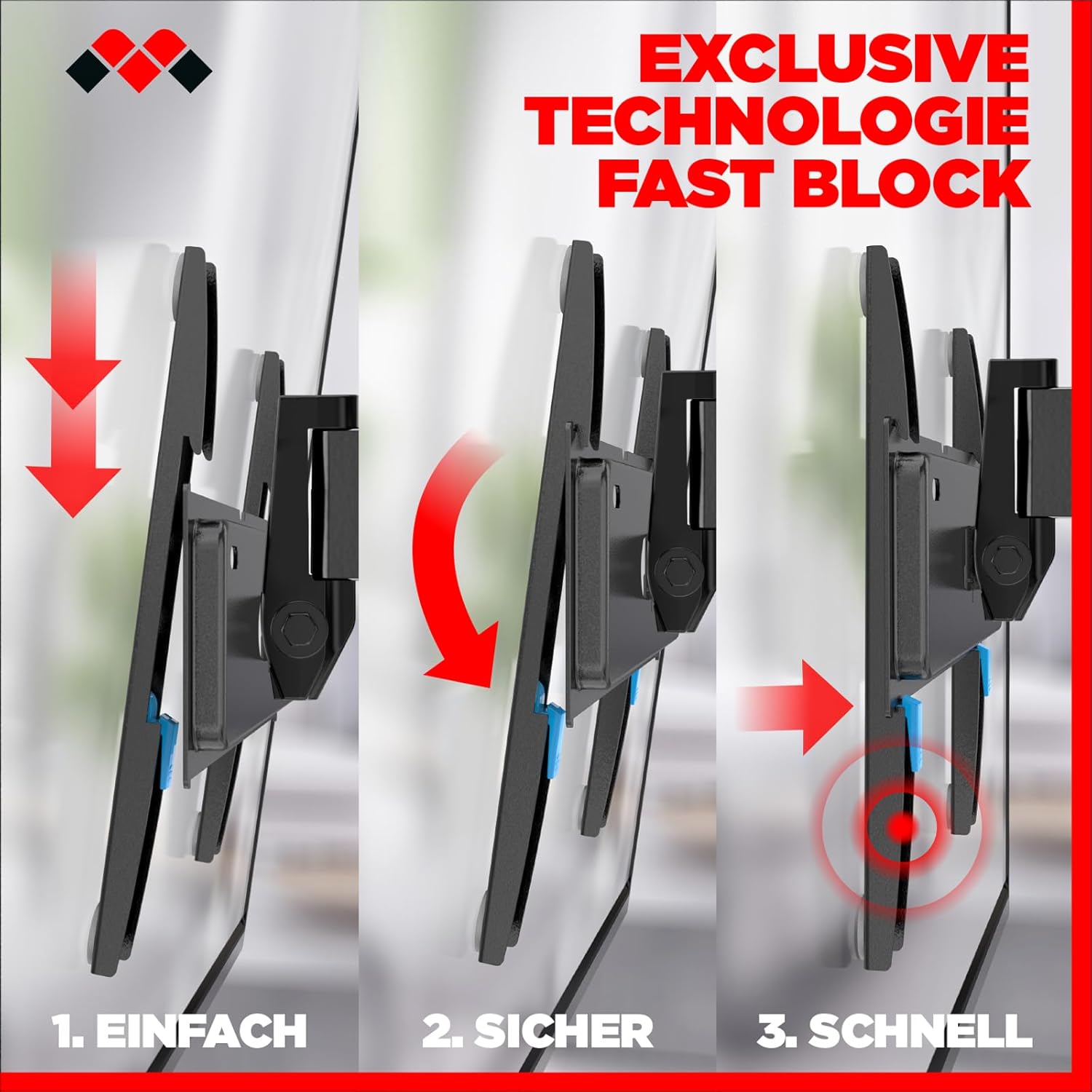 - FAST BLOCK: Innovatives Verriegelungssystem zum Befestigen des Fernsehers an der Halterung: einfach, sicher und schnell; installieren Sie den Fernseher in wenigen Schritten, auch allein: Schrauben Sie die Halterungen an die Rückseite des Fernsehers,