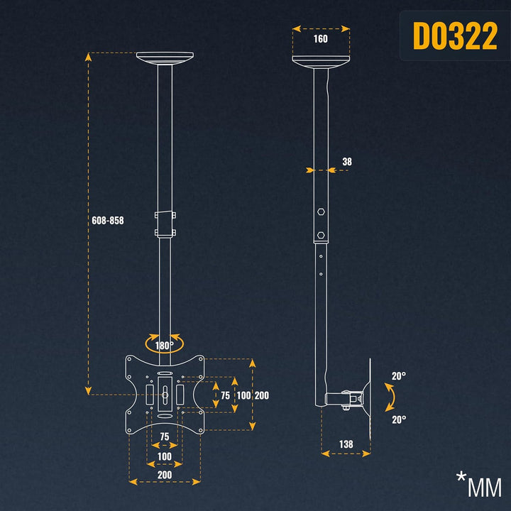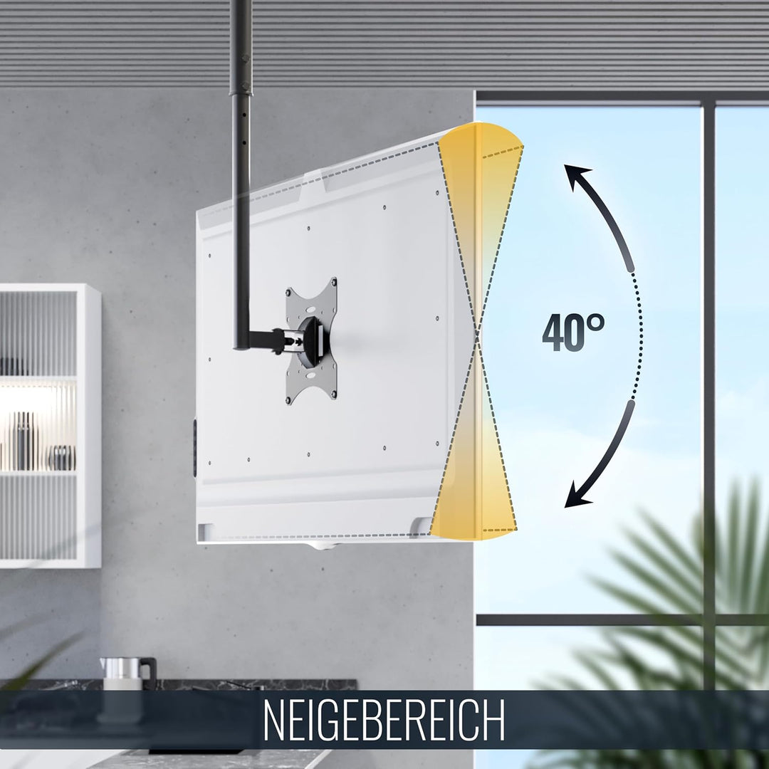 - 𝗙𝗨𝗡𝗞𝗧𝗜𝗢𝗡𝗘𝗡: Dieser Fernsehhalter ist flexibel +/-90 Grad schwenkbar. Neigbar um +/-20. Montage an Decke / Deckenbefestigung. Deckenabstand 608mm - 858mm.