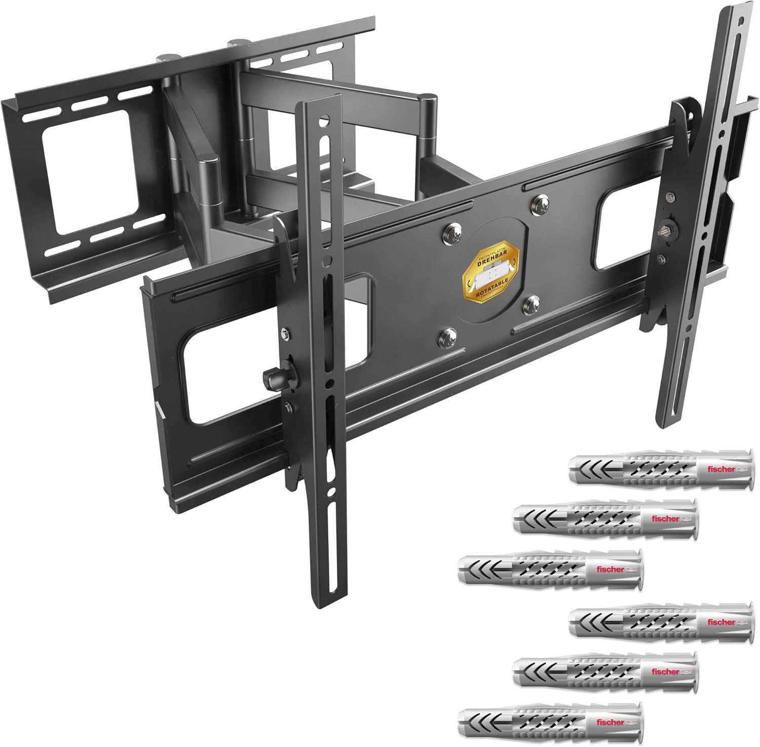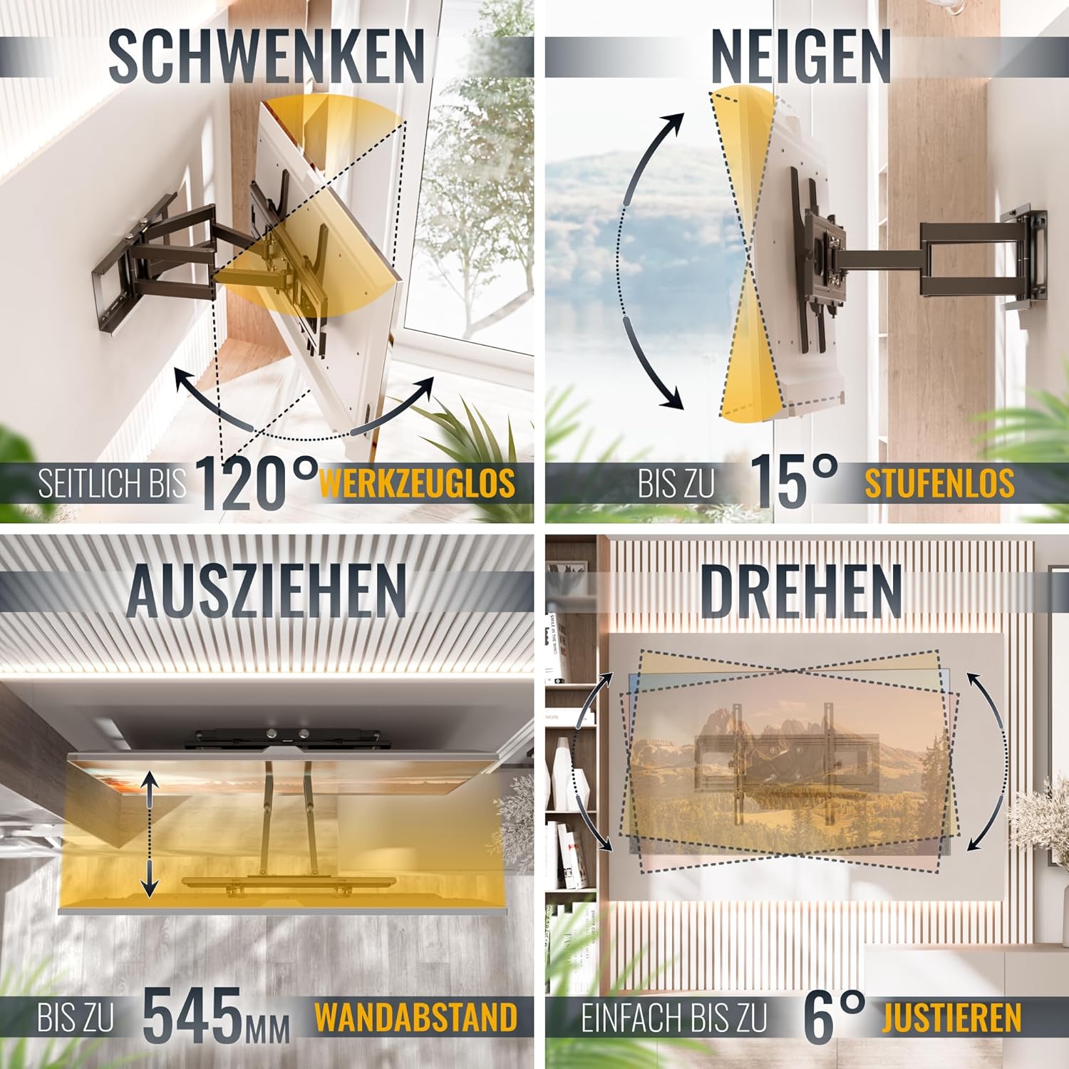 - 𝗙𝗨𝗡𝗞𝗧𝗜𝗢𝗡𝗘𝗡: Diese Fernseherhalterung ist bis 120 Grad schwenkbar wenn Bildschirmbreite max 80cm. Der Neigebereich liegt bei +/-15 Grad. Wandabstand zwischen 115mm - 545mm. Zur optimalen Einstellung nach der Montage ist die