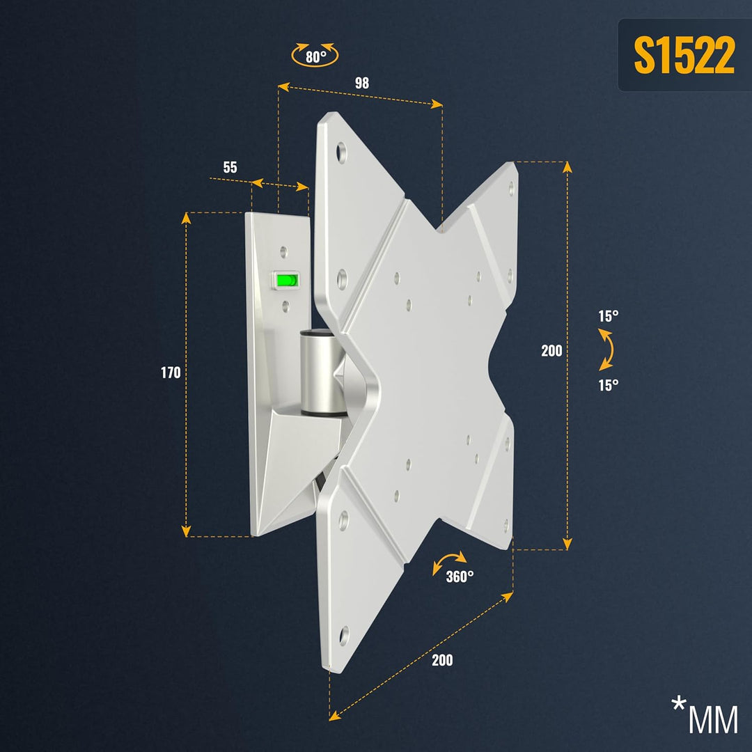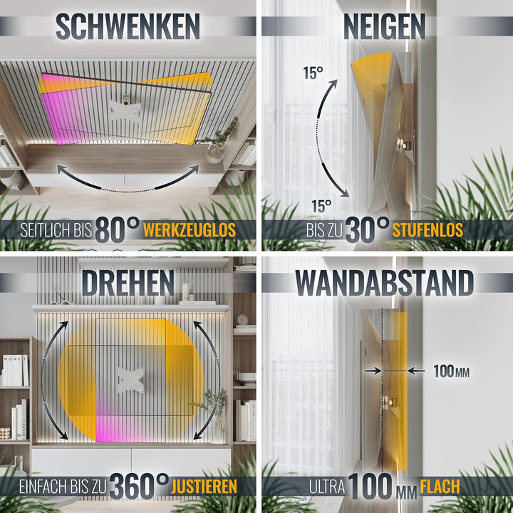 - 𝗙𝗨𝗡𝗞𝗧𝗜𝗢𝗡𝗘𝗡: Diese Fernseherhalterung ist bis +/-40 Grad schwenkbar je nach Bildschirmbreite. Der Neigebereich liegt bei +/-15 Grad. Der Wandabstand beträgt 100mm