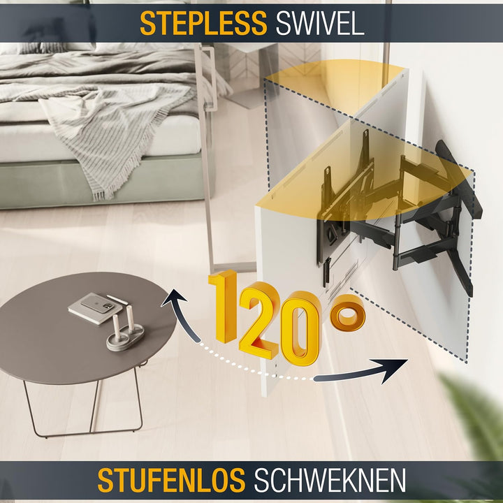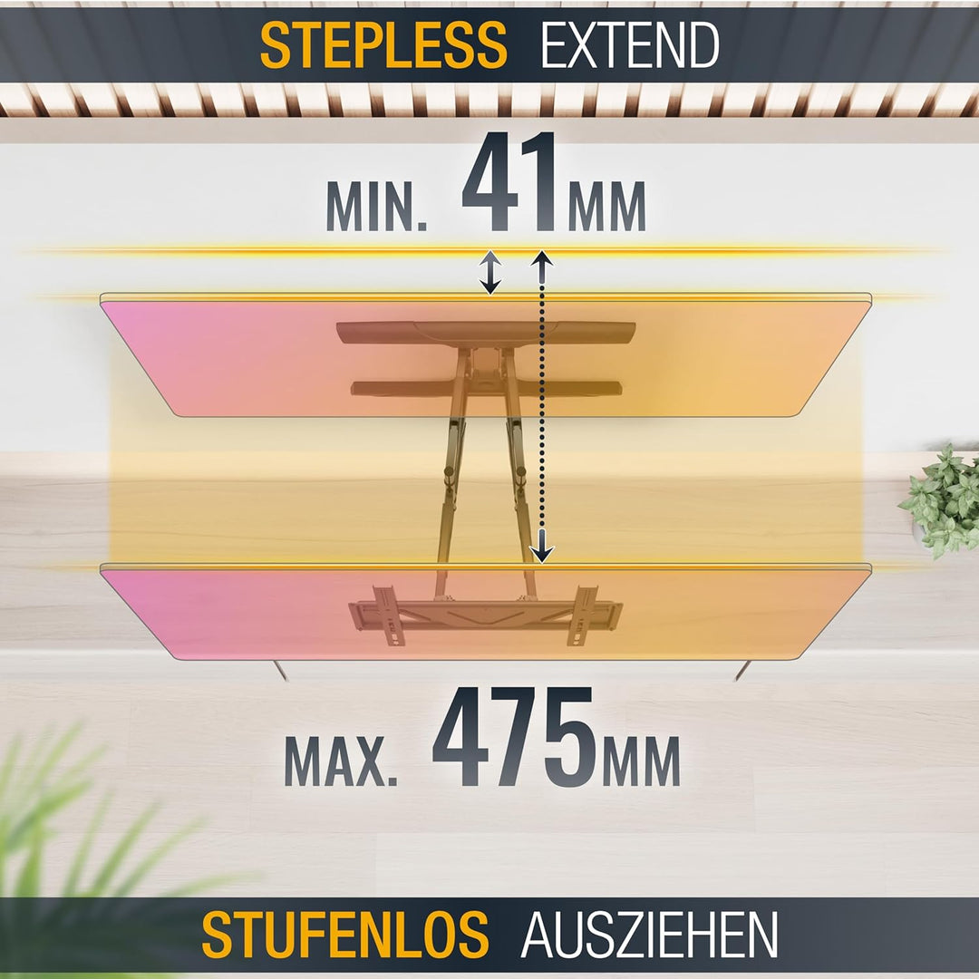 - 𝗙𝗨𝗡𝗞𝗧𝗜𝗢𝗡𝗘𝗡: Diese Fernseherhalterung ist bis 120 Grad schwenkbar je nach Bildschirmbreite. Der Neigebereich liegt bei +15/-7 Grad. Wandabstand zwischen 41mm - 475mm. Zur optimalen Einstellung nach der Montage ist die
