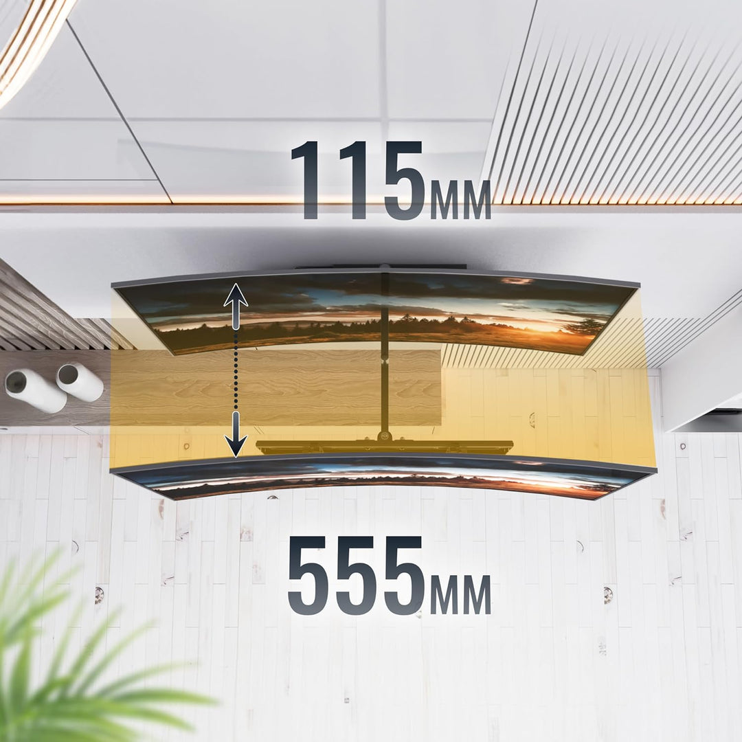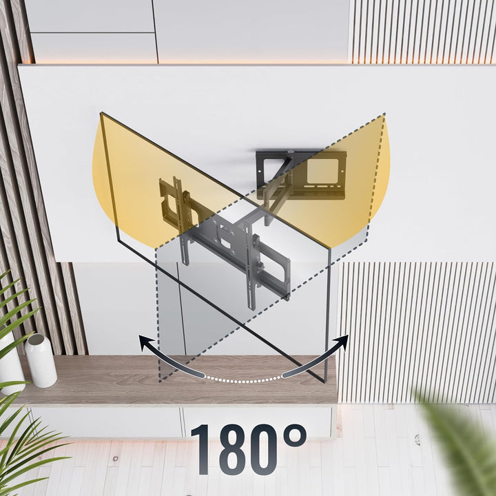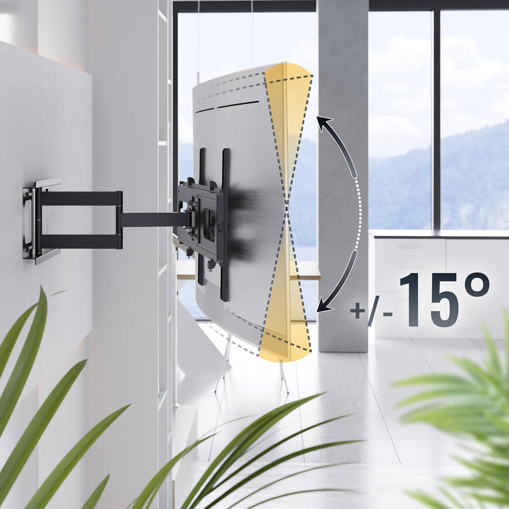 - 𝗙𝗨𝗡𝗞𝗧𝗜𝗢𝗡𝗘𝗡: Diese Fernseherhalterung ist bis 180 Grad schwenkbar wenn Bildschirmbreite max 90cm. Neigebereich +/-15 Grad. Wandabstand zwischen 115mm - 555mm. Zur optimalen Einstellung nach Montage ist Frontplatte +/-6 Grad